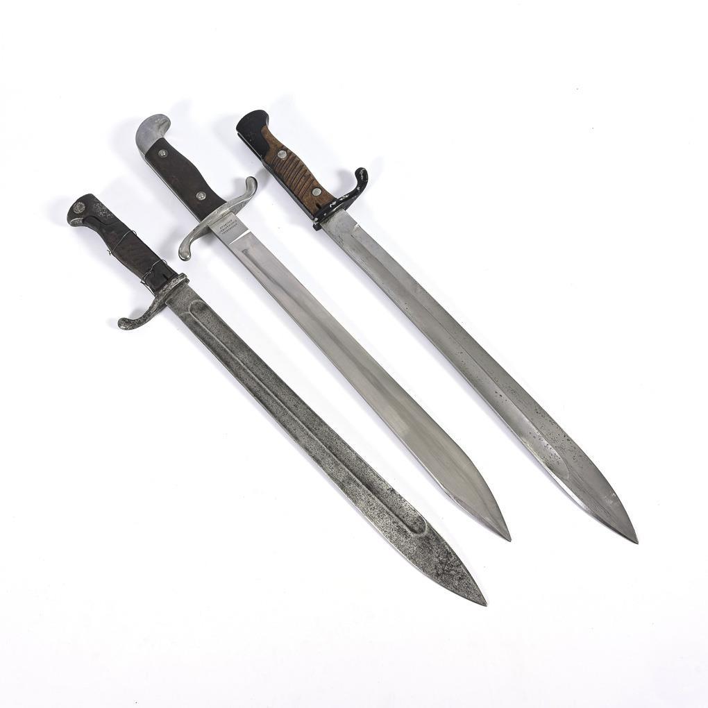 2x Seitengewehr Model 98/05, wohl bayrische Ausführung mit Loch im Griff. Gerade, einschneidige Klinge mit breiterem Vorderteil, Spitze in der Mittellinie, breiter Hohlschliff. Ein Stück mit hellen Griffschalen aus Holz, Metallteile an Griff und Scheide schwarz lackiert, ungemarkt. Anderes Stück mit defekten dunklen Griffschalen, Metallteile konserviert, mit Korrossionsnarben. Gemarkt "Waffenfabrik ...RAG", auf Rücken bekröntes "W 16". L Waffe 50 cm. / Argentinien, "Modelo Argentino 1909", "Weyersberg, Kirschbaum & Co, Solingen". Klinge wie oben beschrieben, Griff mit Holzschalen, s-förmige Parierstange. Metallscheide und Waffe mit identischer Nummerierung. Gesamt L 52,5 cm.