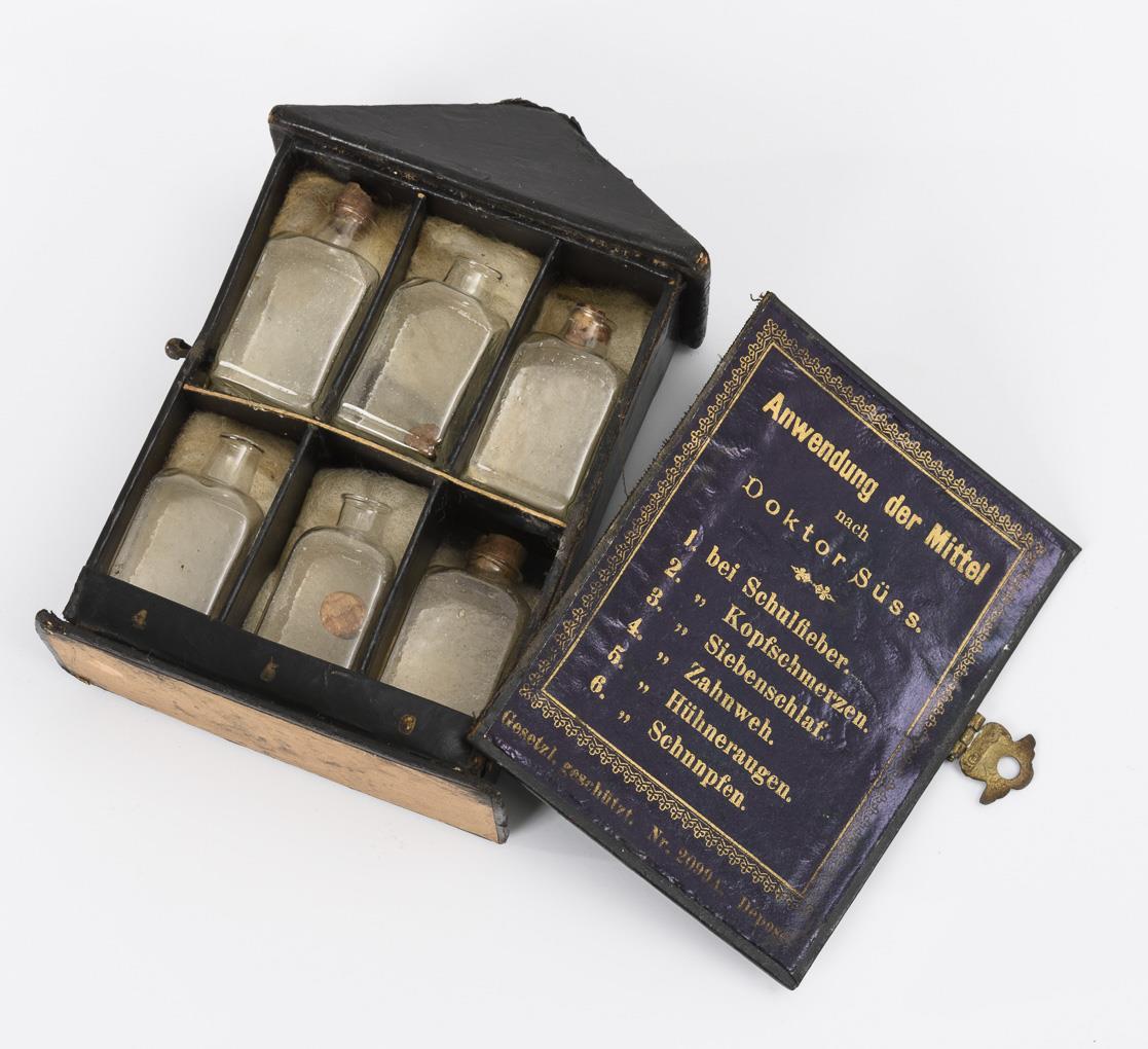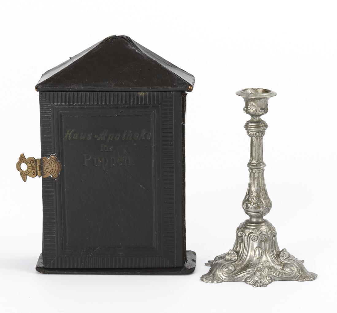 "Haus-Apotheke für Puppen" und Zinnleuchter.