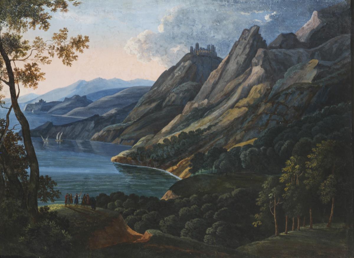 Bergige Küstenregion mit Festungen auf den Gipfeln unter dunklen Wolken. Riss, leichte Knicke.