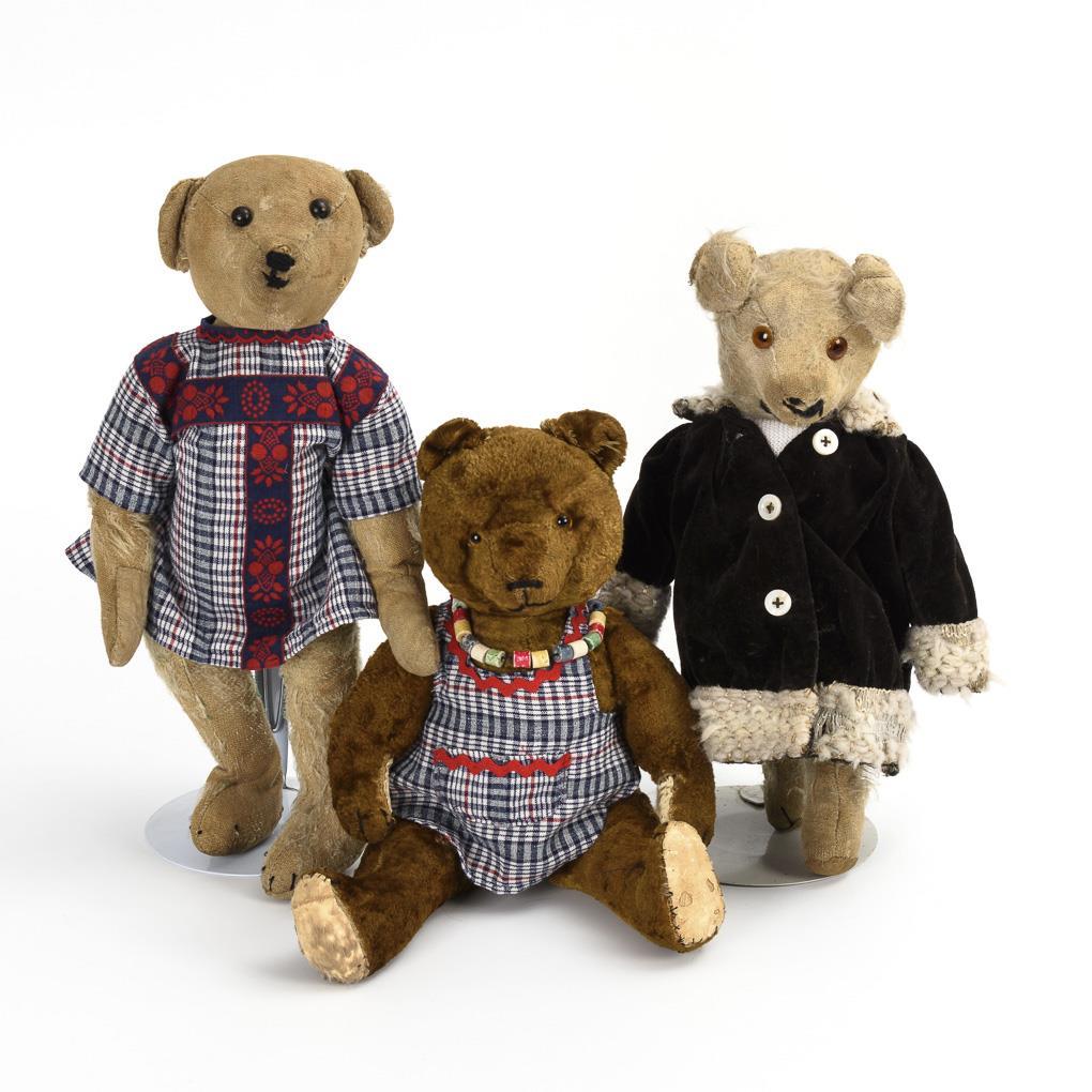 1x mit Schuhknopfaugen, 2x jünger mit Glasaugen. Alle 3 bekleidet. Altersspuren, Defekte und Reparaturen.