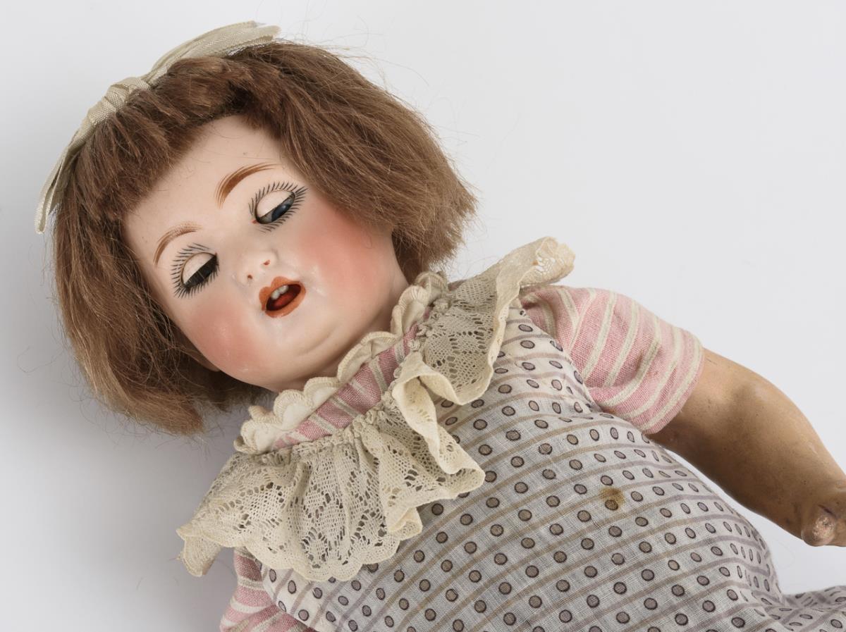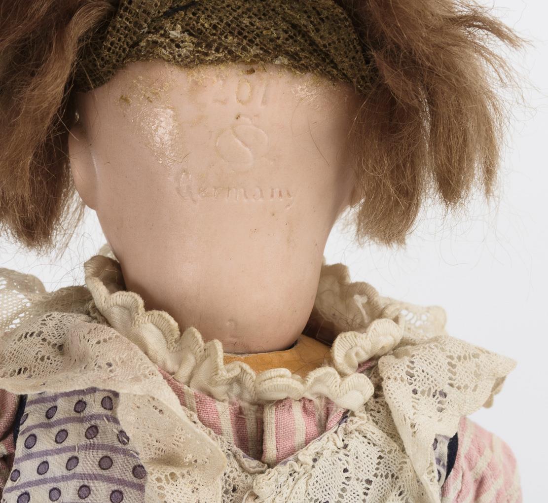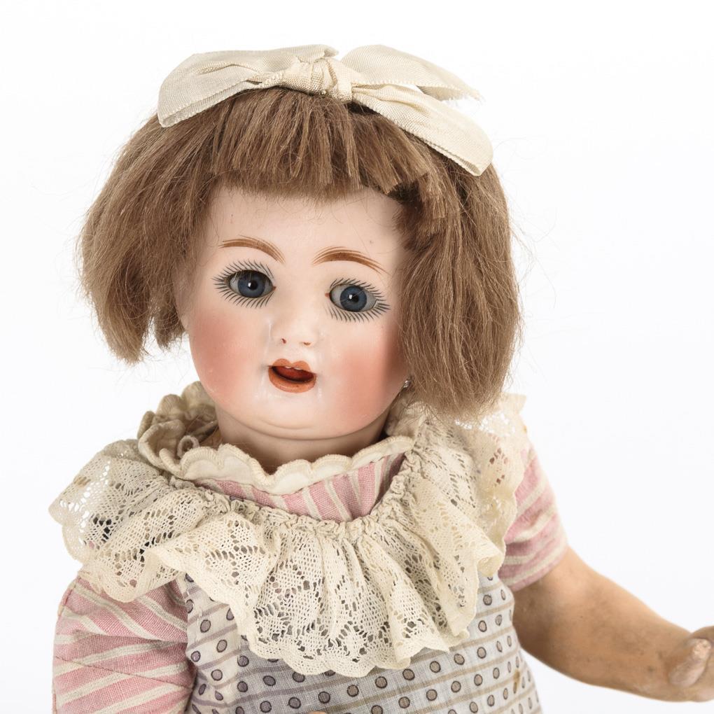 Kurbelkopf, blaue Schlafaugen, hellbraune Mohairperücke. 5-teiliger Sitzbabykörper. Alte Kleidung mit gemusterter Schürze, weiße Haarschleife, braune Wachstuchschuhe. Perücke fest: Kopf nicht durchleuchtet, jedoch ohne sichtbare Defekte. Finger und Zehen bestoßen und retuschiert.