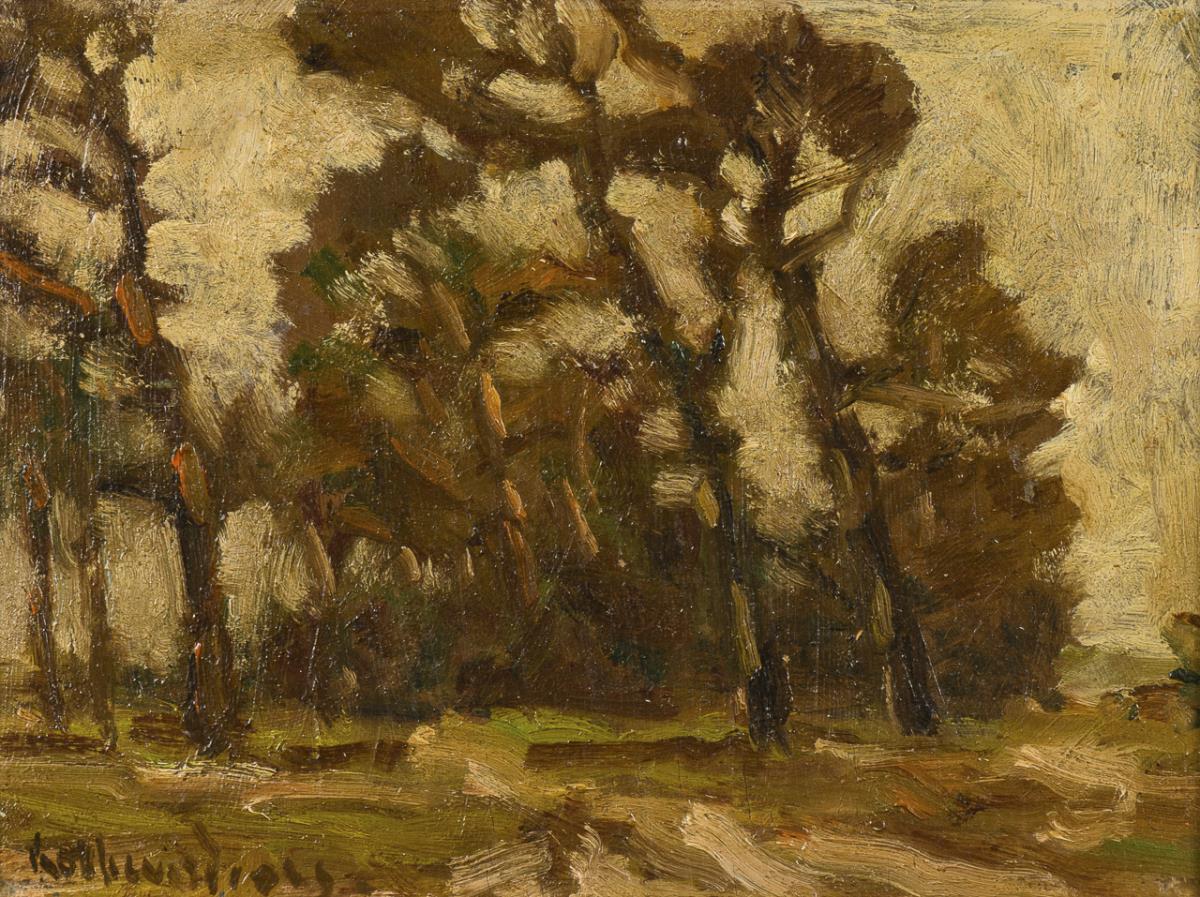 Zwei impressionistische Landschaften mit Bäumen unter grauem Himmel.