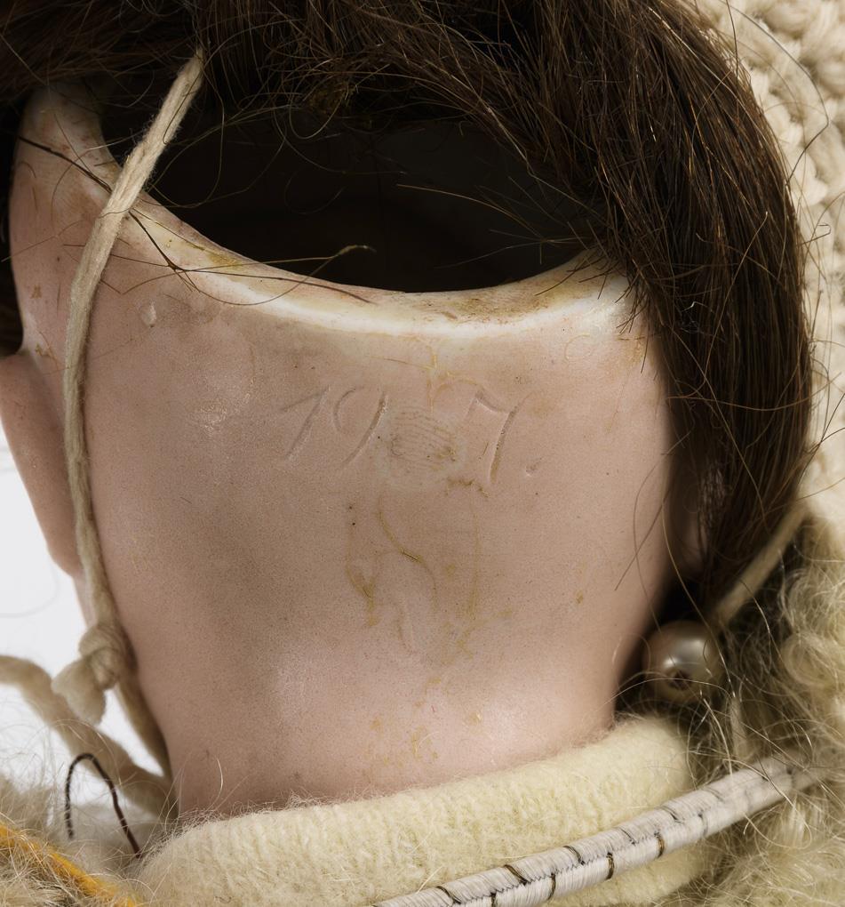 Kurbelkopf, feste braune Glasaugen, Ohrringe, braune Echthaarperücke mit Zopf. 15-teiliger Gliederkörper. Blauer Rock, weißer Pullover, weißer Wollmantel, passende Mütze, rosa Muff, weiße Lederschuhe. Kopf durchleuchtet: ohne Defekte, lediglich kleiner Brandriss in der rechten Ohrmuschel. Körper eventuell überstrichen.