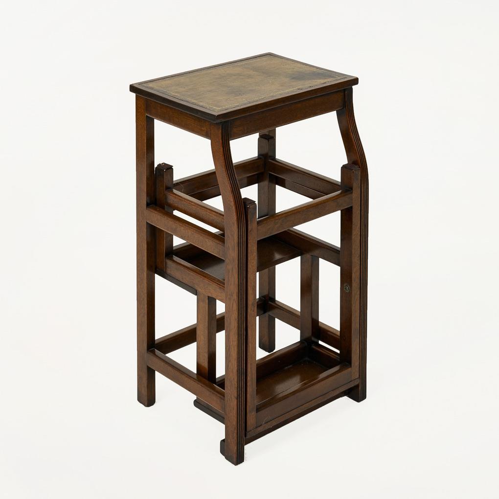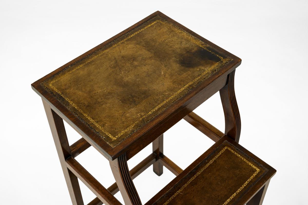 Schlichter Hocker mit verstrebtem Gestell und ausklappbaren Stufen; Stufen mit eingelegtem braunem Leder und Goldprägung. Leichte Alters-/Gebrauchsspuren.