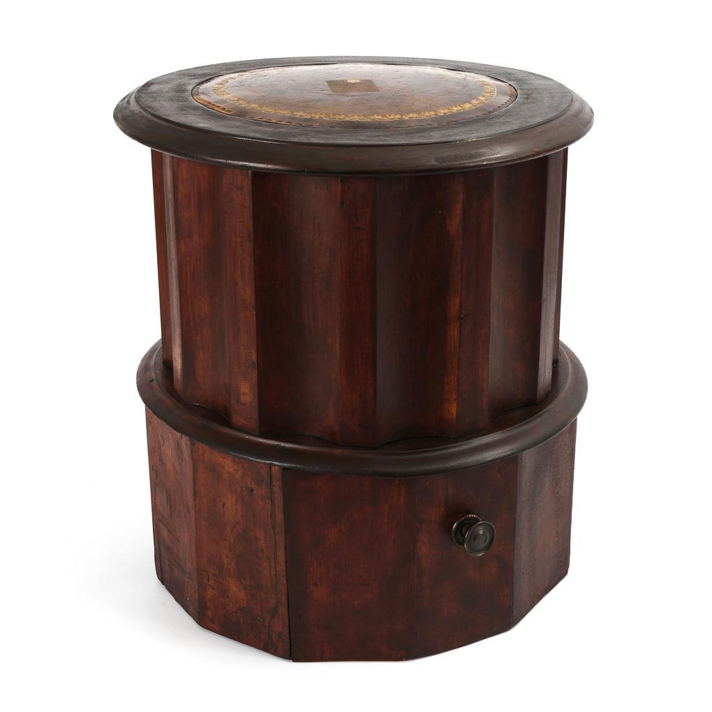 Furnier mahagonifarben gebeizt, Leder mit Goldprägung, Messingknauf, grüner Filz. H 45 cm, Ø 42 cm.