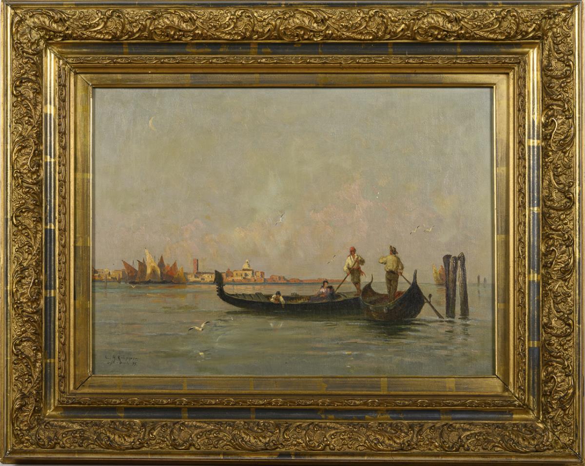 Gondoliere im Gespräch mit einem Fischer nahe dem Hafen der italienischen Stadt. Zwei restaurierte Stellen mit Hinterklebungen.