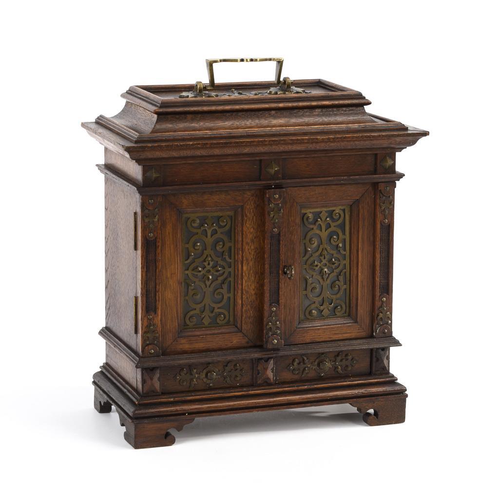 Miniaturschrank mit ornamentalen Messing-Appliken auf dem Korpus und an den verglasten Türen sowie Tragegriff auf gestuftem Dach. In der Sockelzone 1 Schub, hinter den Türen 7 Schübe um zentrales Hohlfach. 1 Glas gesprungen.