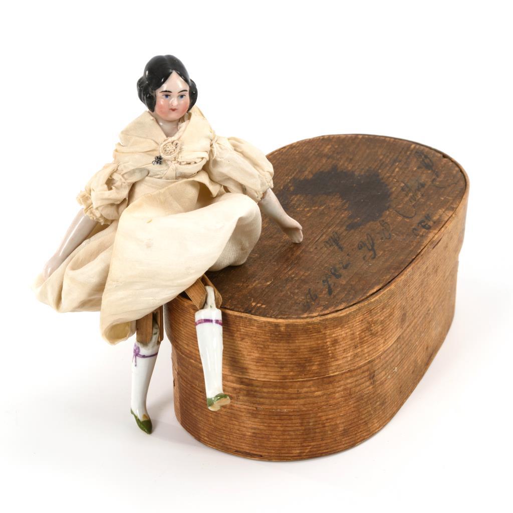 Kleine Brustkopf-Puppe mit modellierter Frisur, Porzellangliedern und Holzkörper. Langes weißes Kleid.