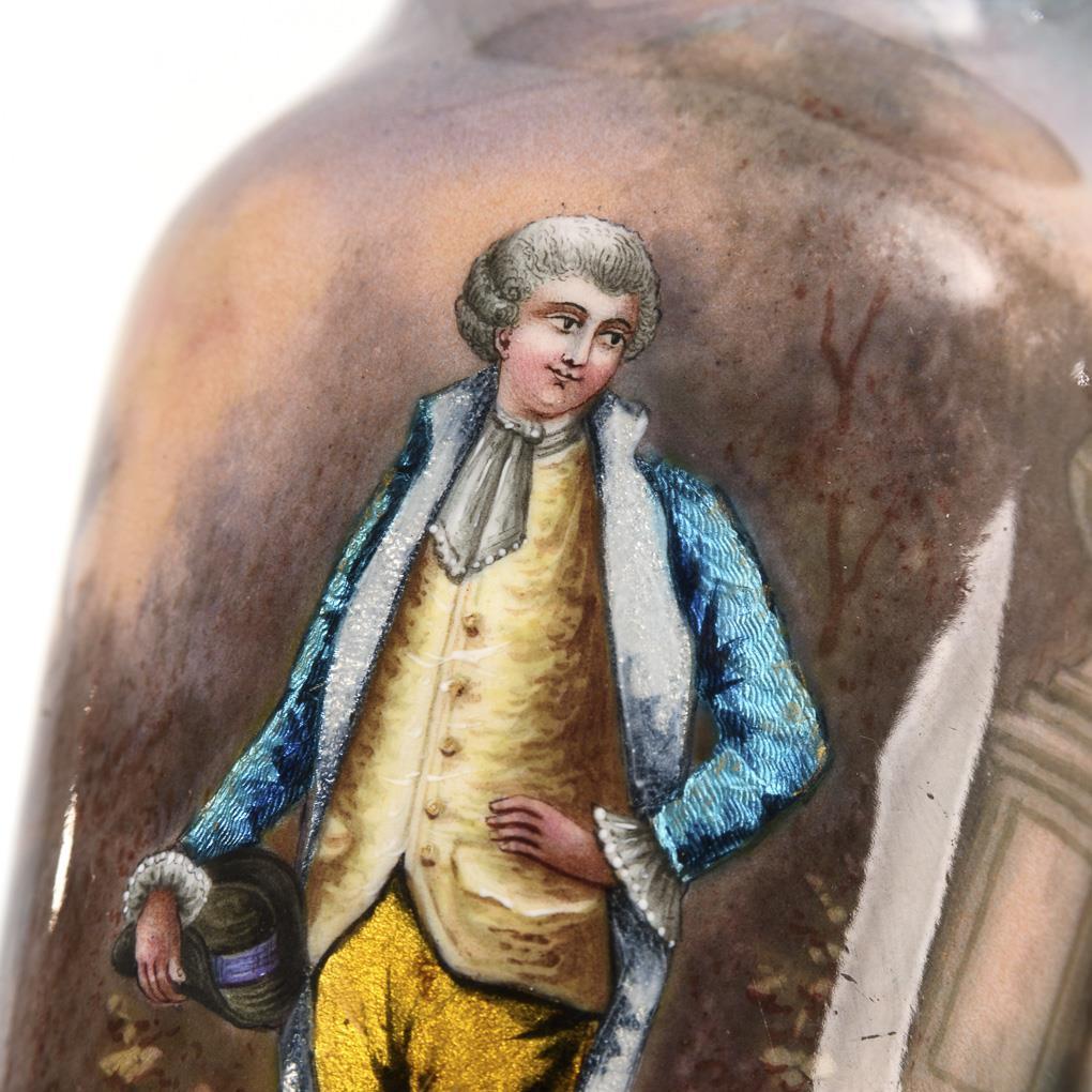 Allseitige Emailmalerei auf Kupfer, teils transluzid über Folien, Messing-Montierung. H 11,5 cm.