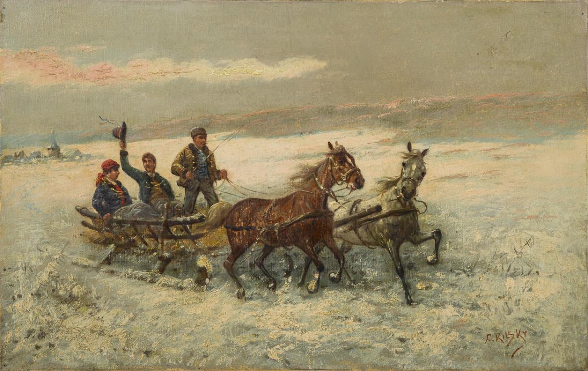 Bauernpaar mit Kutscher im Schlitten im schnellen Galopp durch den tiefen Schnee.