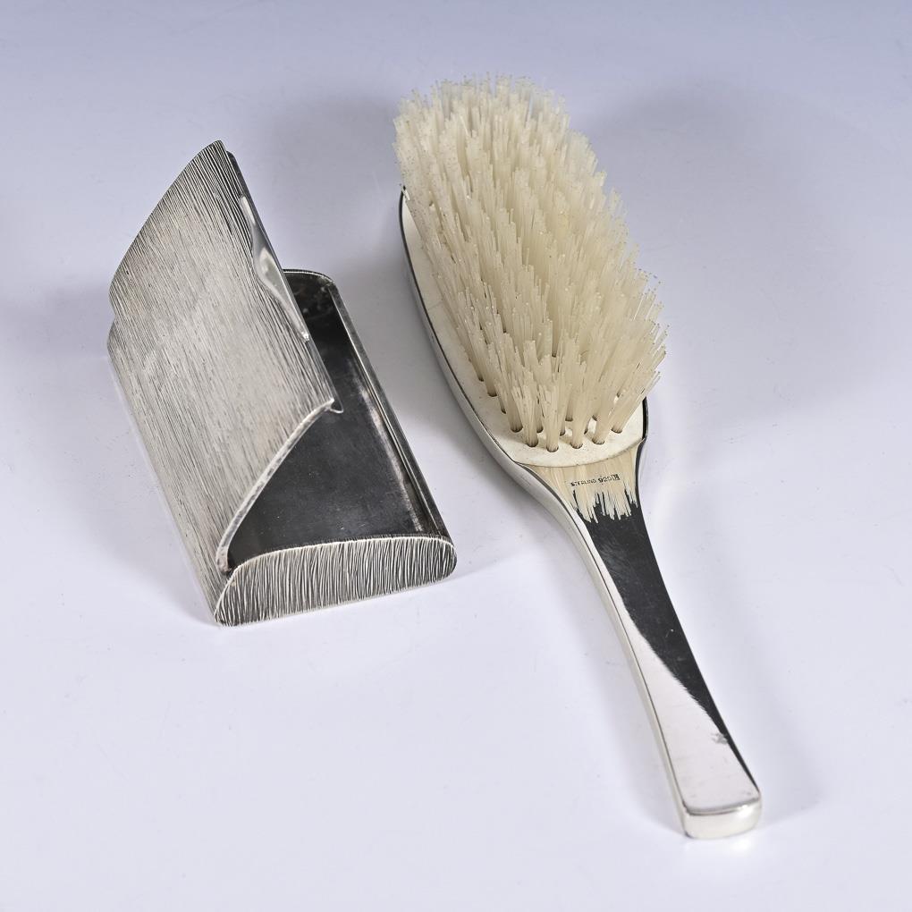 Elegante Haarbürste (L 21,5 cm) und kleines Etui mit Strukturoberfläche (108 g, 2 x 9 x 5 cm). Deckel des Etuis gedellt.
