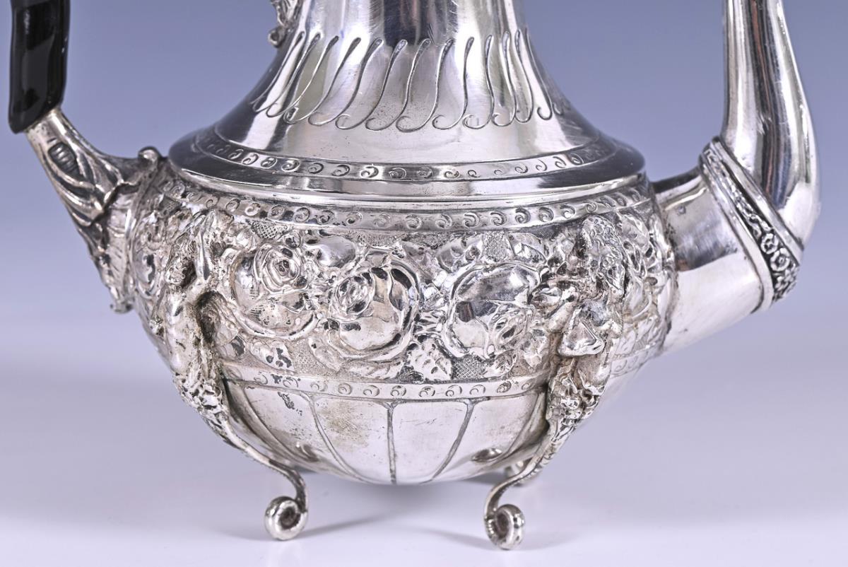 Reich verzierte Kanne mit Rosenreliefs. Boden etwas gedellt, kleine Defekte im Email.