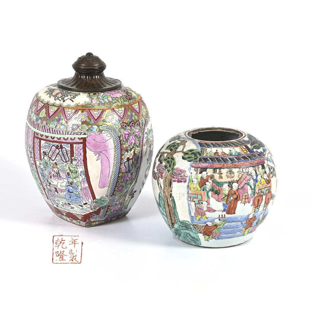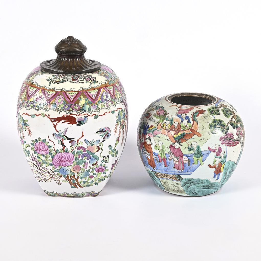 Vierkantige Vase, gemarkt mit rotem Stempel, Bemalung in Emailfarben und teilweise Golduntergund. Der fehlende Deckel ist durch eine alte Metallmontage ersetzt, die durch eine Stange im Boden der Vase verschraubt ist. H 33 cm. / Kugelförmige Vase ohne Deckel, mit vielfiguriger Szene eines Kinderfestes mit Bootsfahrt und Drachentanz. Alte Chips im Innenrand. H 20 cm.