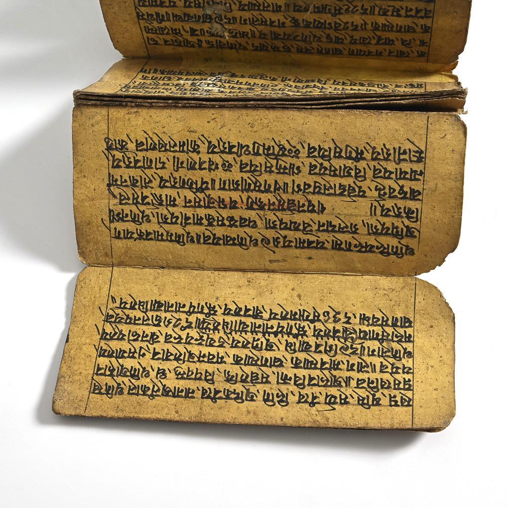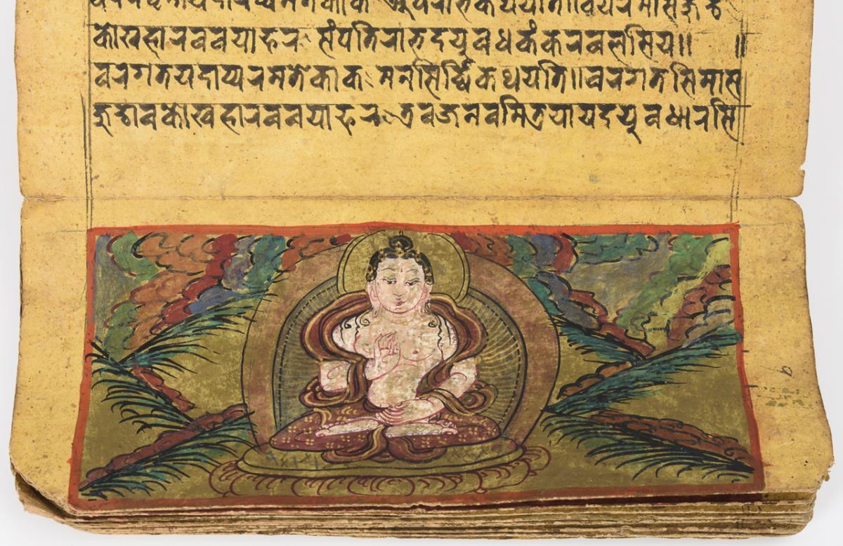 Auf 28 Papierblättern handgeschriebener Sanskrit(?)text mit 7 ganzseitigen gemalten Götterdarstellungen. Alters- und Nutzungsspuren.