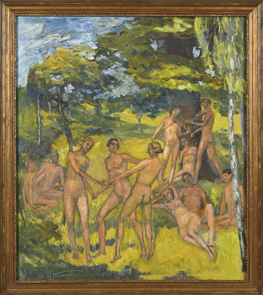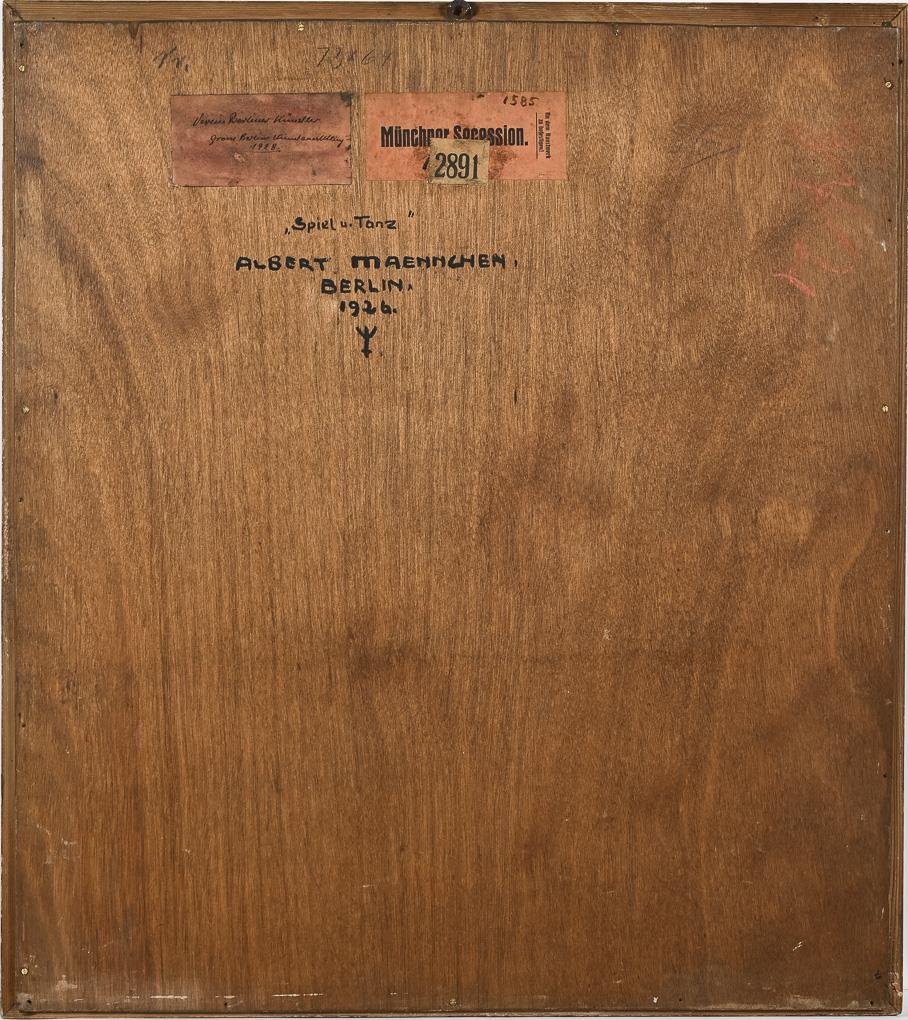 Tempera/Papier/Holz. Links unten signiert, verso bezeichnet/betitelt sowie Klebezettel mit Hinweis auf die Große Berliner Kunstausstellung 1928 und Klebezettel der Münchner Secession mit Nr. 2891. Datiert: 1926.