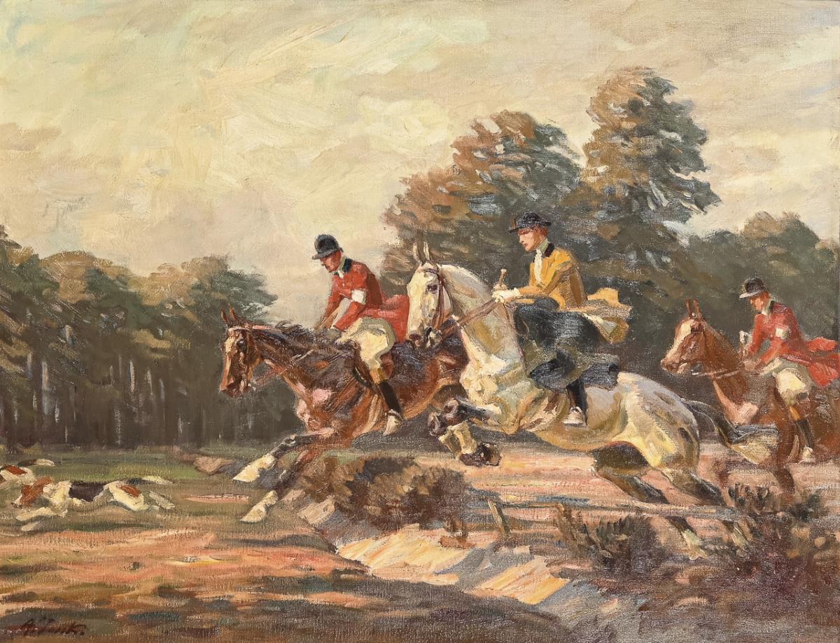Die Reiter in der typischen Jagdkleidung im schnellen Galopp hinter den vorauseilenden Hunden am Waldrand.