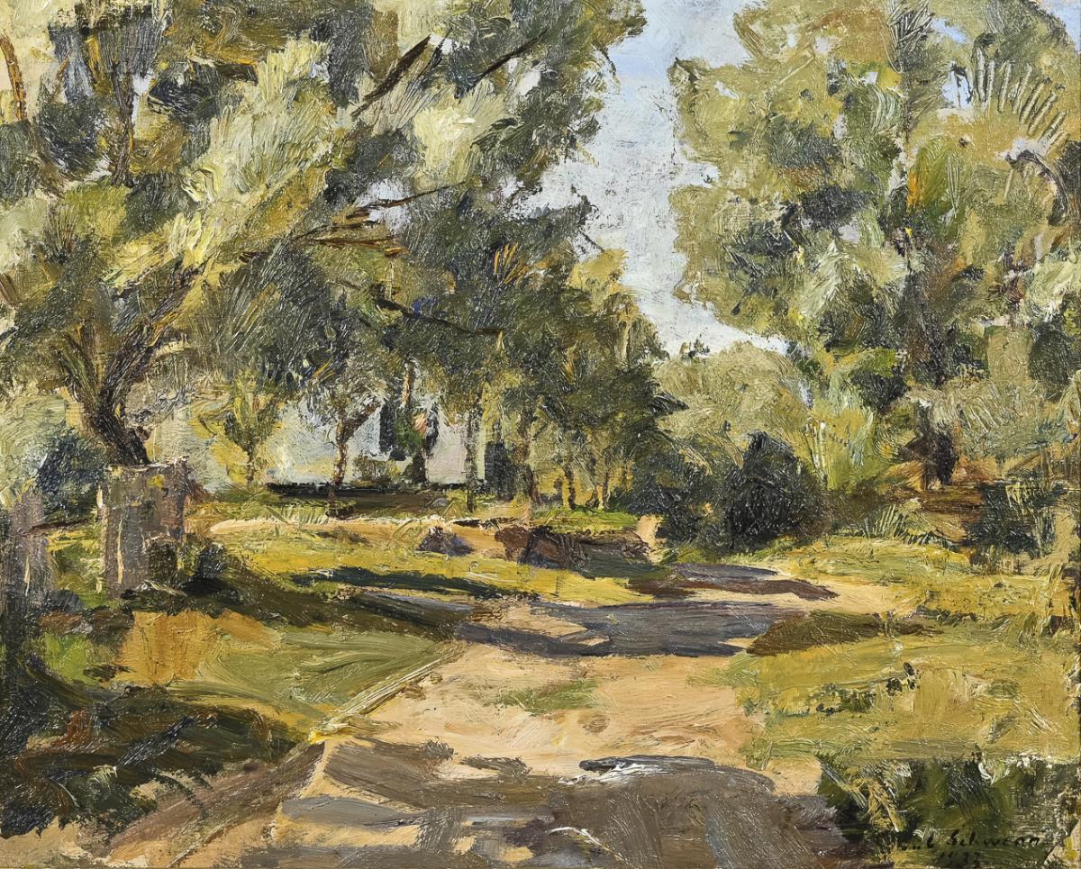 Pastose neoimpressionistische Landschaft mit schmaler Straße zwischen Bäumen im Sonnenschein. Zwei kleine Defekte.