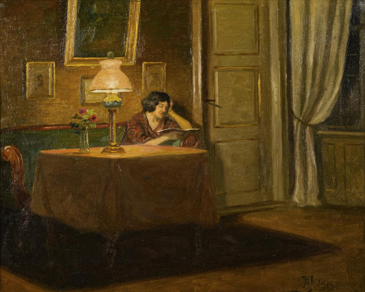 Junge Frau mit einem Buch bei abendlichem Lampenschein in der Stube. Leichte Altersspuren.