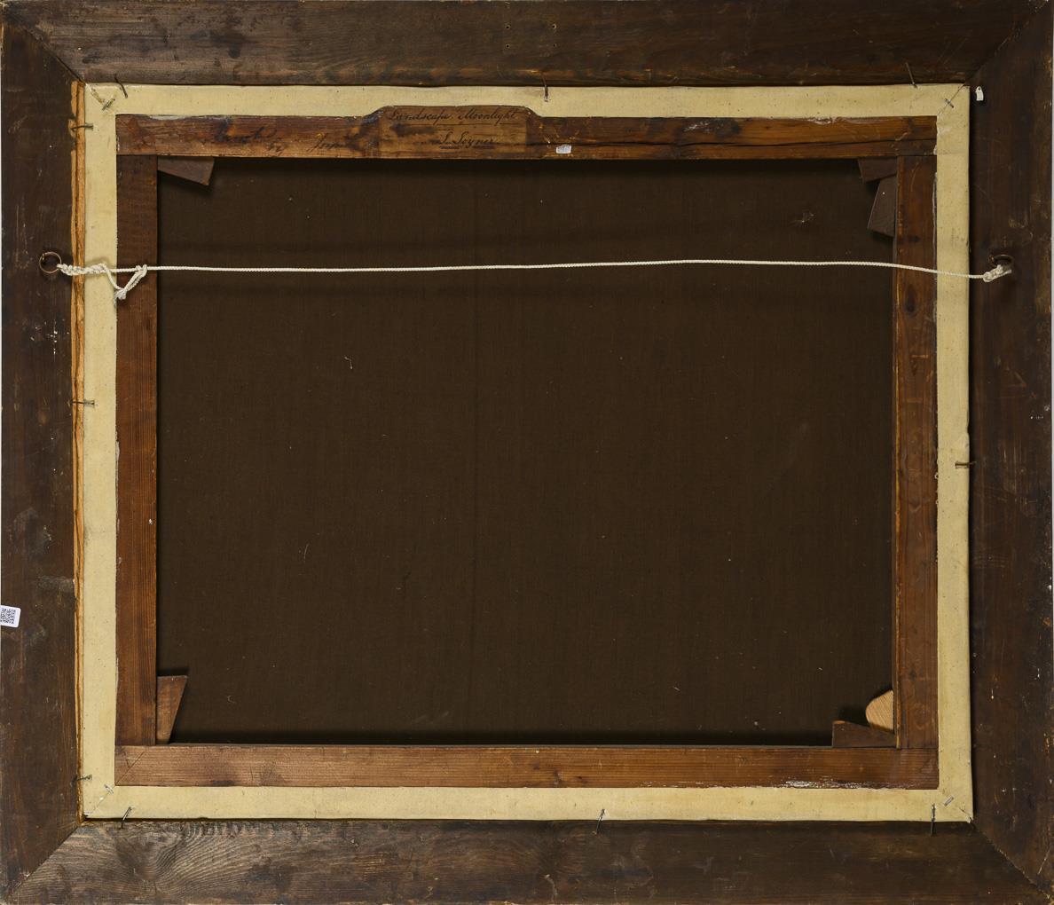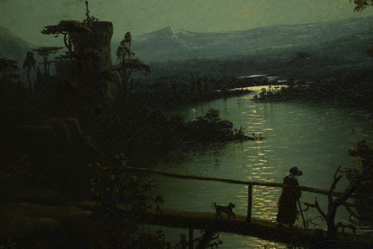 Staffagefiguren nahe der Wassermühle bei hellem Mondlicht. Leinwand doubliert.