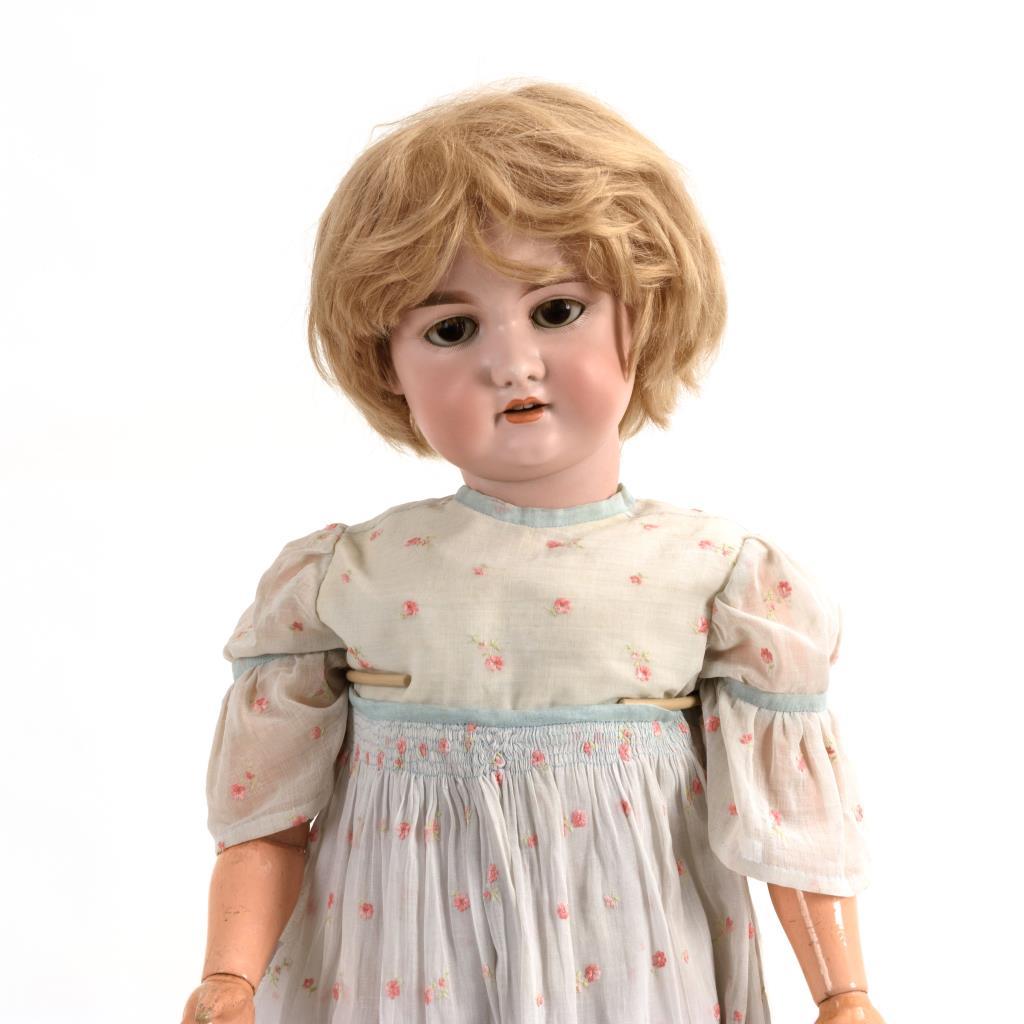 Kurbelkopf, braune Schlafaugen, blonde Echthaarwimpern, offener Mund, jüngere blonde Echthaarperücke. 15-teiliger Gliederkörper. Helles Kleid mit rosa Blütenstickerei. Kopf durchleuchtet: ohne Defekte. Körper bespielt, linke Beinöffnung defekt, 1 Finger fehlt.
