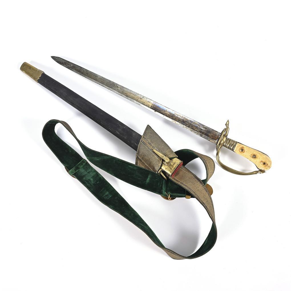 Gerade, breite, einschneidige Klinge mit breitem Hohlschliff. Spitze in der Mittellinie und beidseitig geschärft. Unteres Drittel gebläut, mit Musterung. Faustbügel endet an beiden Seiten als Tierhuf, Griffschalen wohl aus Hirschhorn. Schwarze Lederscheide mit einer beweglichen Öse. / Schulterriemen oder Gehänge wohl jünger. Darauf Schieber mit Wappenrelief des Deutschen Kaiserreiches (ab 1871), Unterseite mit grünem Samt bezogen. Eine Griffschale geklebt, die andere mit kleinem Ausbruch. Klinge mit Kerben in der Schneide, etwas verölt.