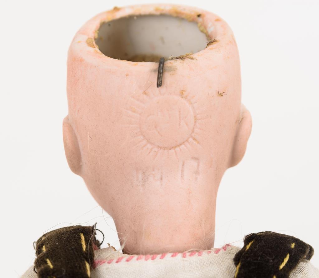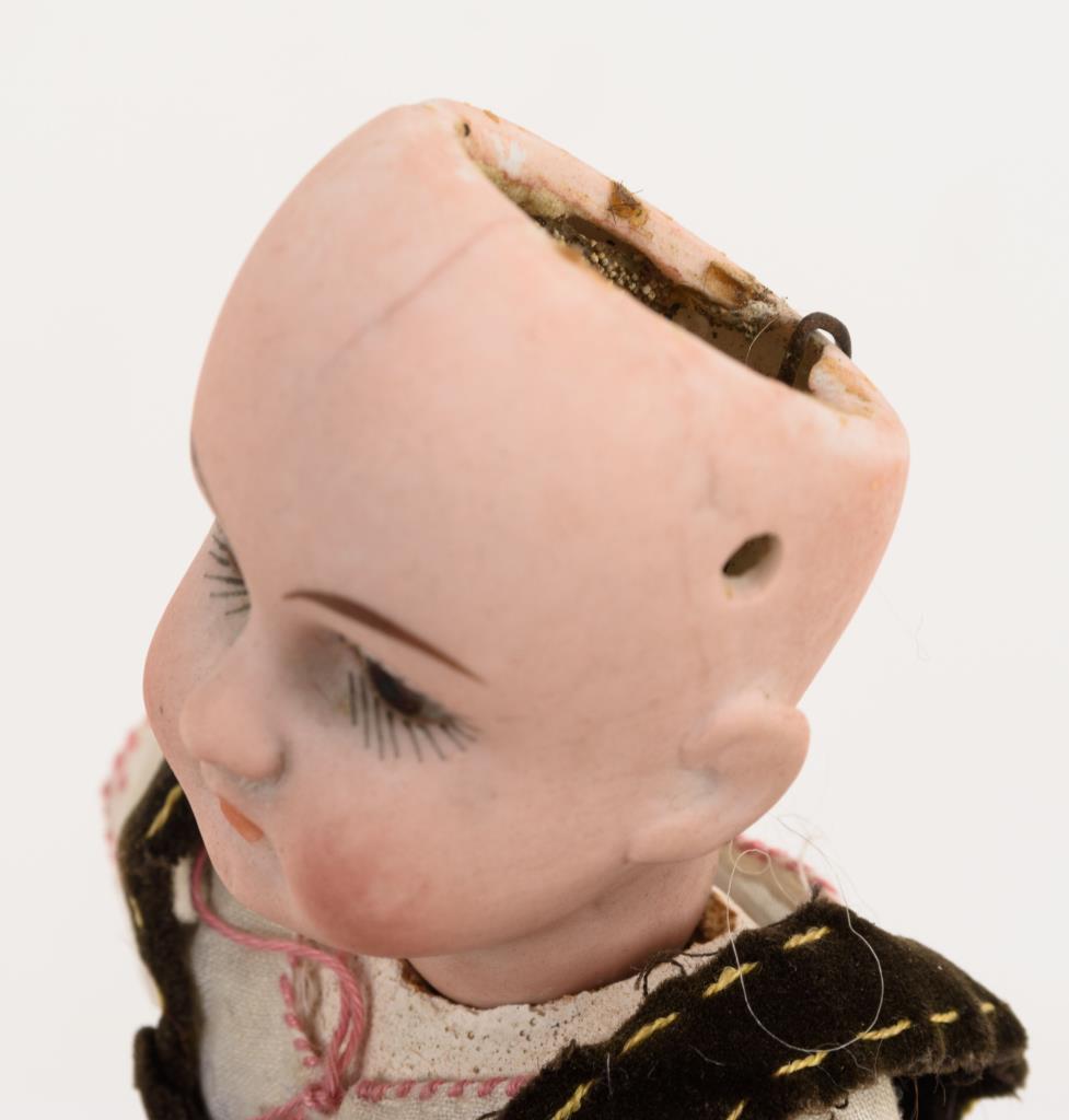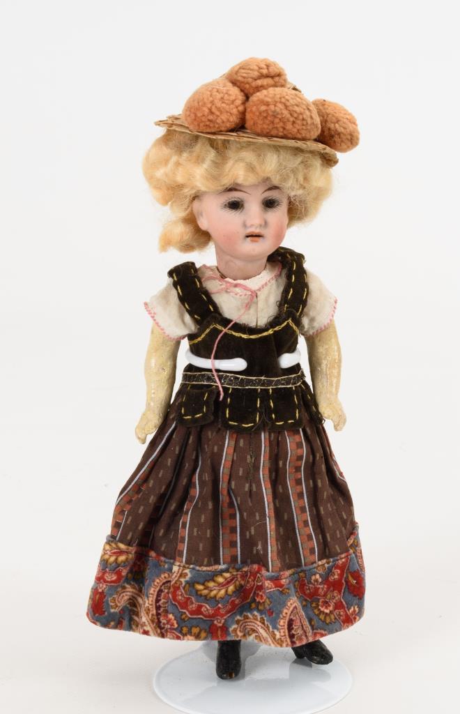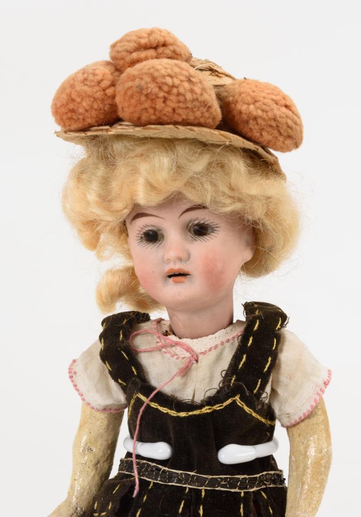 Kurbelkopf, feste braune Augen, offener Mund, jünger ergänzte blonde Mohairperücke. Einfacher, 5-teiliger Stehpuppenkörper mit gemalten Stiefeln. Braun gemusterter Rock, Strohhut. Haarriss an der Stirn, kleiner Ausbruch am Hinterkopf.