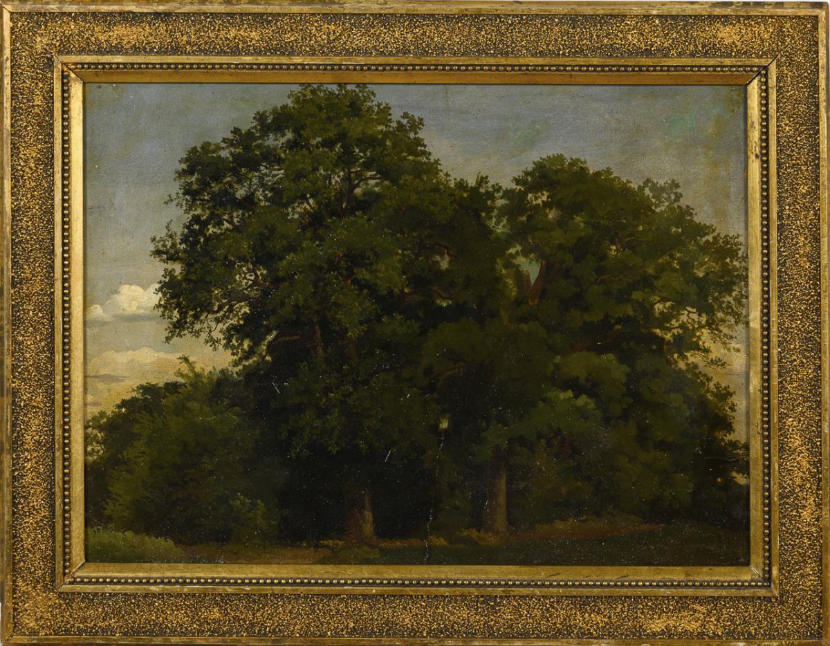 Baumgruppe mit dichtem Blätterdach unter sonnigem Himmel. Altersspuren.