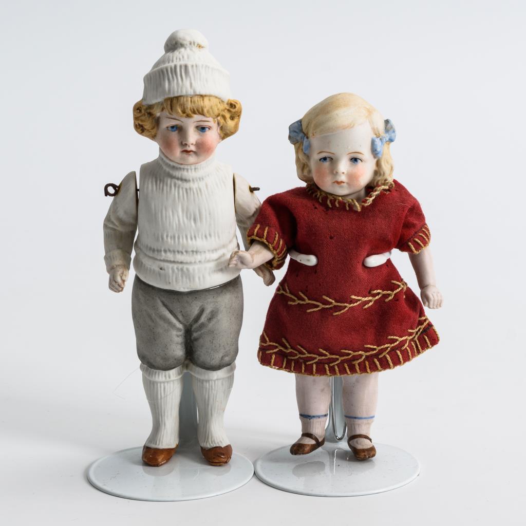 Beide mit festem Kopf, gemalten Augen, geschlossenem Mund, gesplinteten Armen und modellierter Kleidung. Mädchen mit modellierten Haarschleifen und Unterwäsche. In rotem Kleid. / Blondes Kind in Winterkleidung mit Pudelmütze.