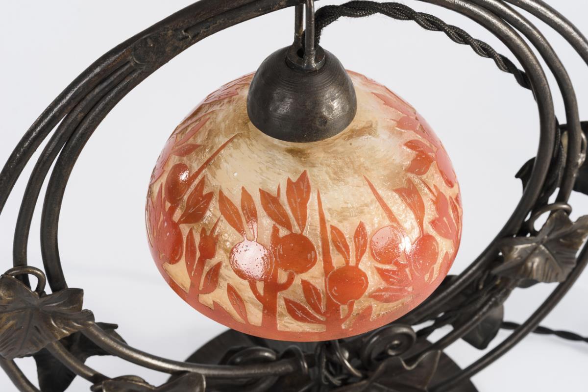 Halbkugeliger Schirm aus farblosem Glas mit orange-rotem Überfang und umlaufend geätzten Früchten. Eingehängt in ein schmiedeeisernes Reifenmedaillon mit Efeublättern. Elektrifiziert.