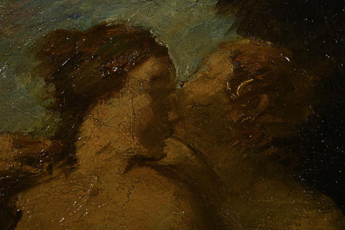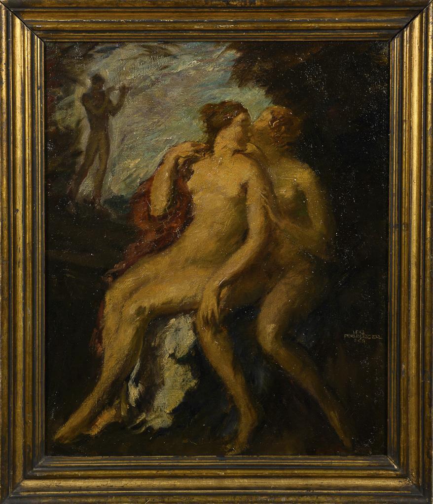 Das nackte Paar beim Liebesspiel an einem Baum mit nahendem Flötenspieler. Leichte Altersspuren.