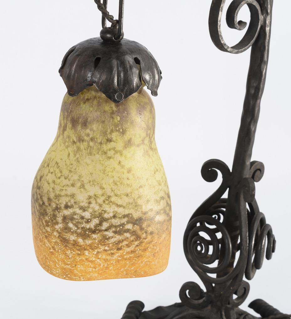 Glockenschirm (H 15,5 cm). Aufgehängt an einem schmiedeeisernen Fuß mit hohem, gebogtem Arm sowie Volutenzier an Schaft und Rundfuß. Alt elektrifiziert (Funktion nicht geprüft).