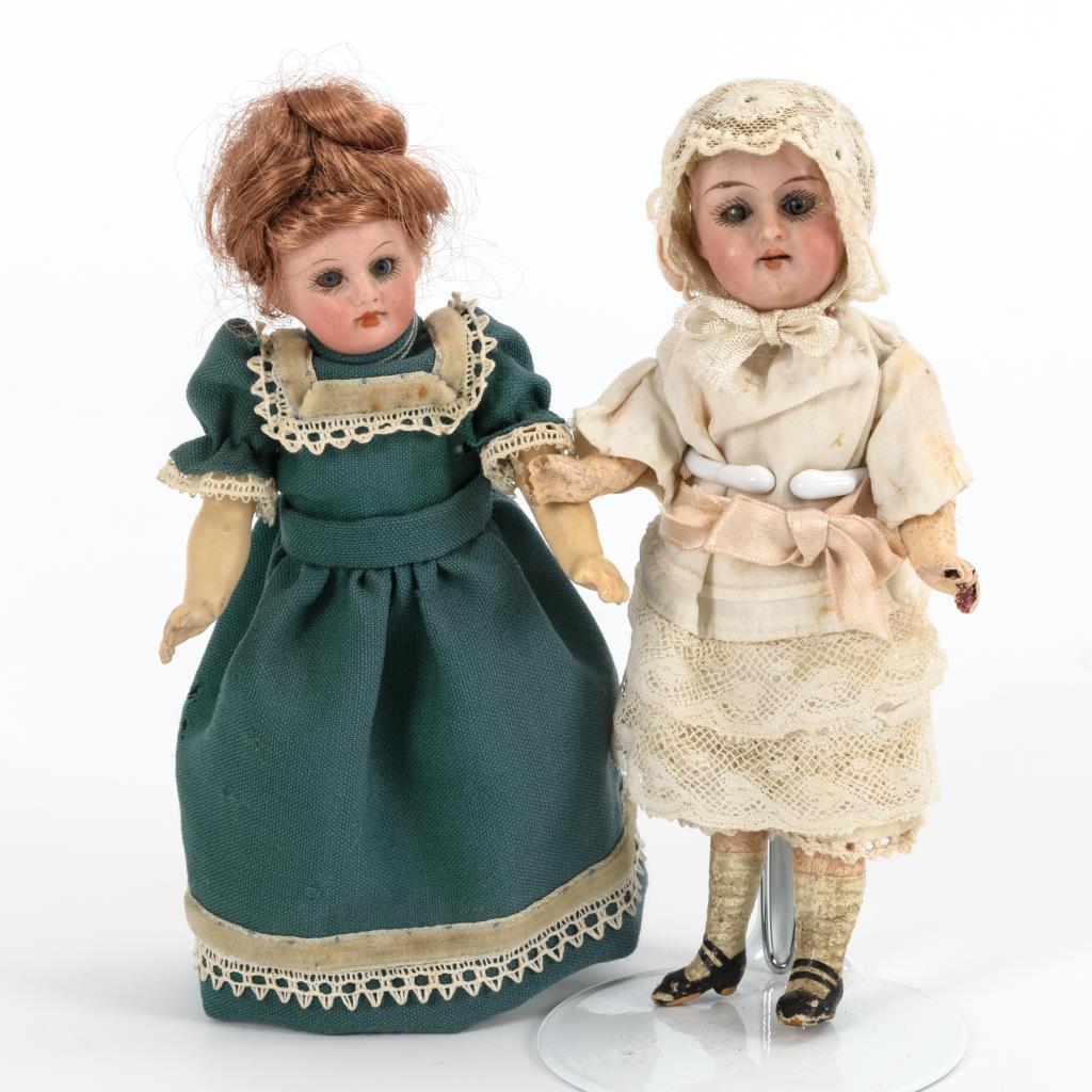 Beide mit Kurbelkopf, Glasaugen, fester Perücke und 5-teiligem Stehpuppenkörper. Grünes Kleid und weißes Kleid. 1 Kopf geklebt, 1 Hand defekt, 1 Körper übermalt.