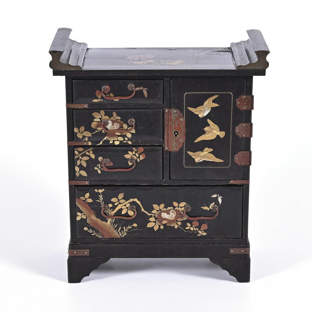 Rechteckiger Korpus, alle Seiten außer Unterboden gelackt, auf vier Flächen Pflanzendekor. Ein großer, gewellter Schub und drei kleine Schübe, hinter der Tür ein Einlegeboden. Mit Schlüssel. Kleine Fehlstellen auf Oberseite.