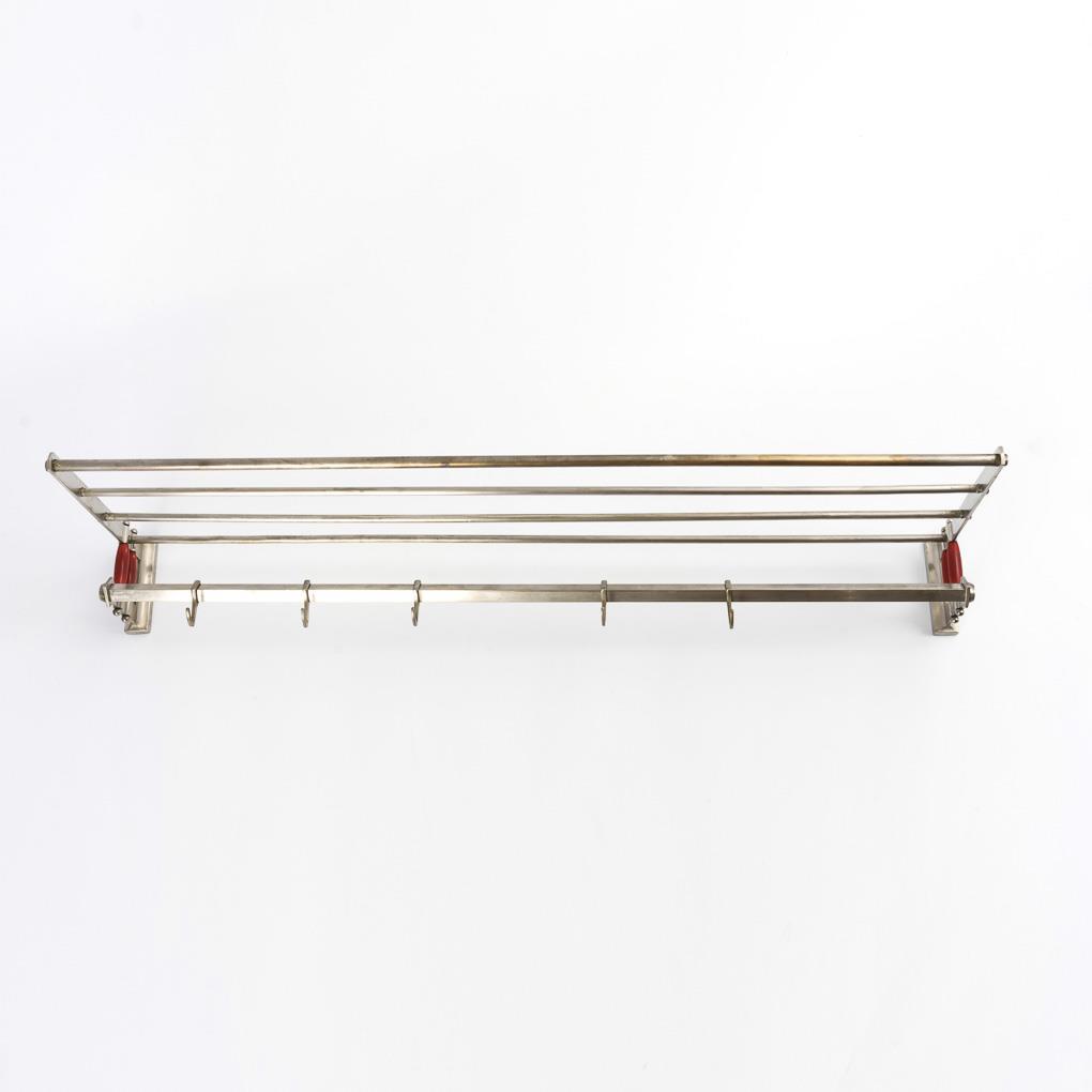 Wandgarderobe mit Hutablage und 5 verschiebbaren Kleiderhaken am Vierkant sowie rote Zierstücke. Teils berieben.