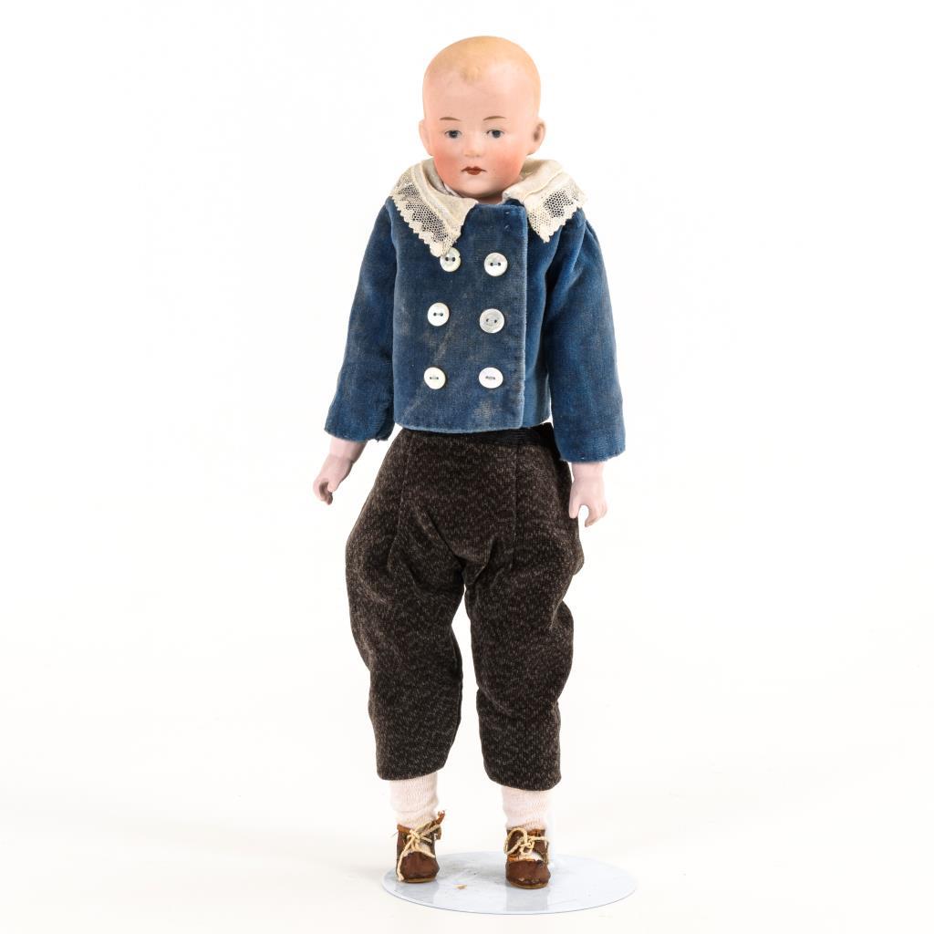 Brustkopf, Vollkopf, gemalte blaue Augen, geschlossener Mund, modellierte Haare. Leinenkörper mit Biskuitgliedern. Blaue Jacke und graue Hose aus Samt. Kleiner Brandriss an Brustplatte hinten.