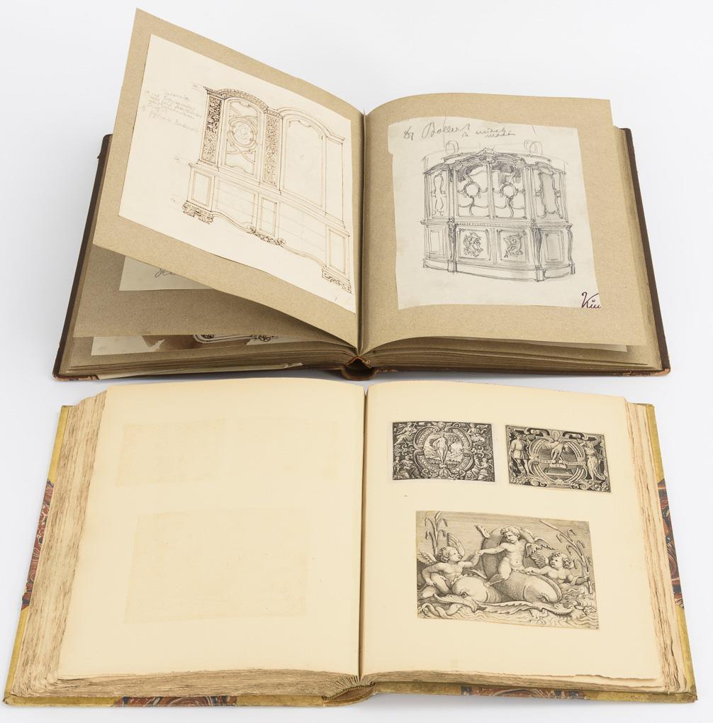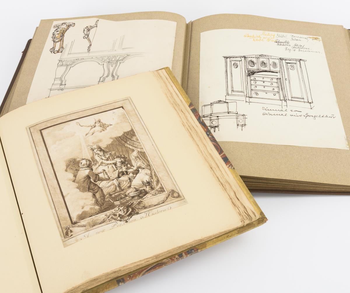 Qualitätvolle Skizzen vor allem zu Möbeln, aber auch Tiere, Genreszene und Architektur. Die Ornamentalen Zierrathen beinhalten verschiedene Motive zu Heiligen, Epitaphien, floralen Ornamenten, Genreszenen überwiegend im Kupferstich. Wenig Knicke.