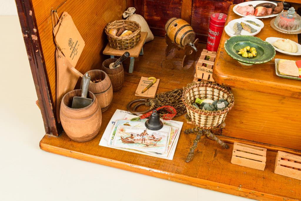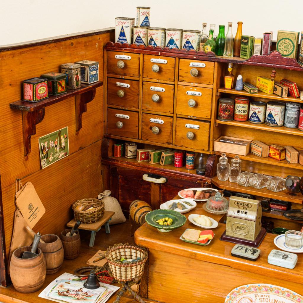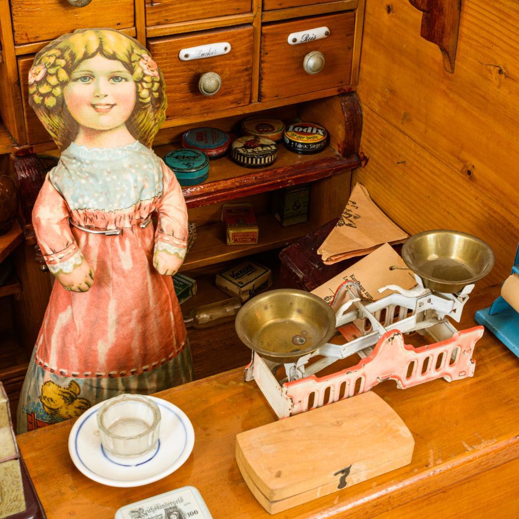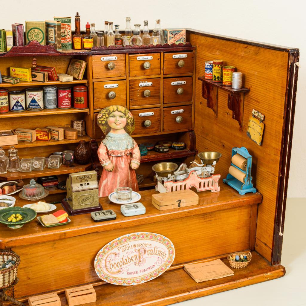Mit hängendem Firmenschild: "Josepha Schmaahl aus Amorbach". Regal-Rückfront mit Porzellanschildern, Ecktresen. Dazu Waage und Gewichtssatz, Zubehör u. a. mit Blechdosen. Dazu "Rackdoll" 1920er Jahre, Stoff bedruckt.