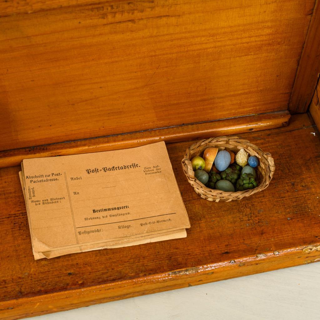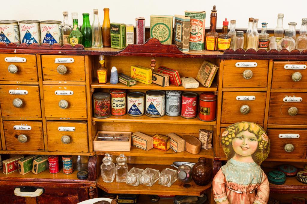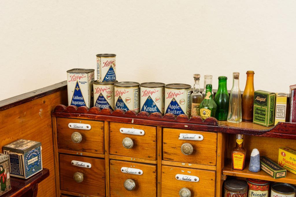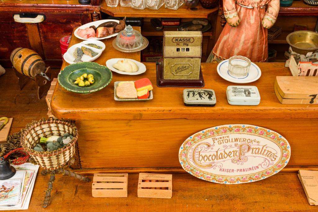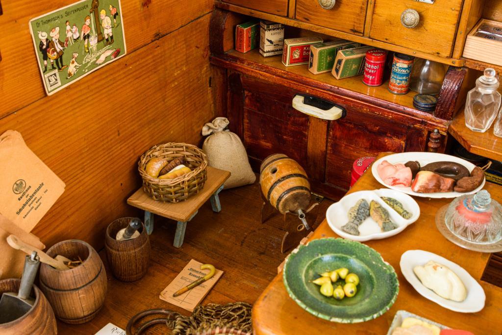 Mit hängendem Firmenschild: "Josepha Schmaahl aus Amorbach". Regal-Rückfront mit Porzellanschildern, Ecktresen. Dazu Waage und Gewichtssatz, Zubehör u. a. mit Blechdosen. Dazu "Rackdoll" 1920er Jahre, Stoff bedruckt.