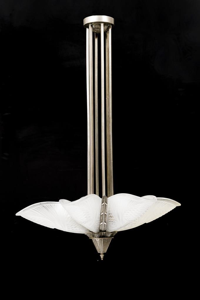 6-flammige Hängelampe mit Gestell aus 6 Mittelstreben und Tellerbaldachin, blütenförmig gestalteter Glasschirm aus 6 einzeln eingesetzten, organisch geformten Glasplatten. Metall mit Korrosionsspuren, Glasplattenrand teils mit Chips.