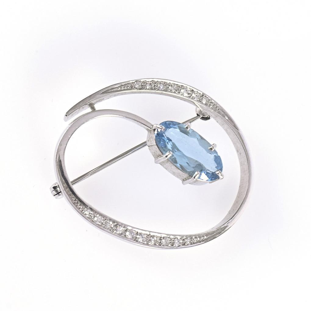 Rahmenbrosche mit krappengefasstem Aquamarin und 17 eingelassenen Diamanten. Kugelhaken.