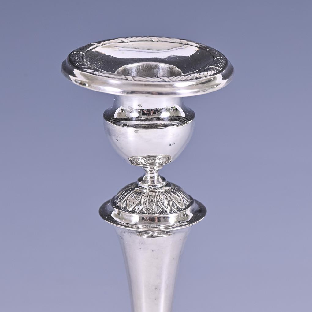1-flammige Leuchter mit Balusterschaft und herausnehmbaren Tropftellern. Am Tüllenansatz jeweils Lötstellen.