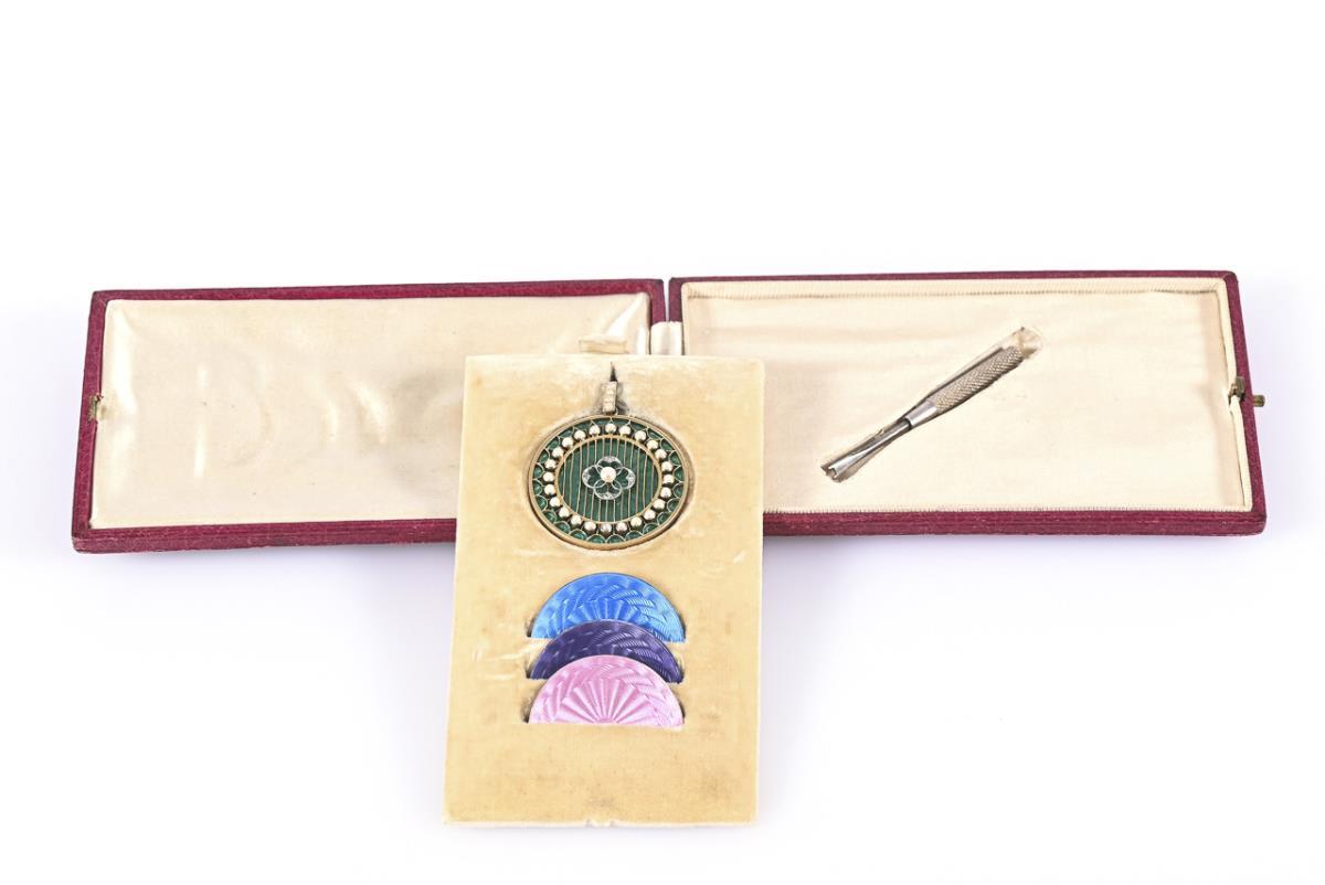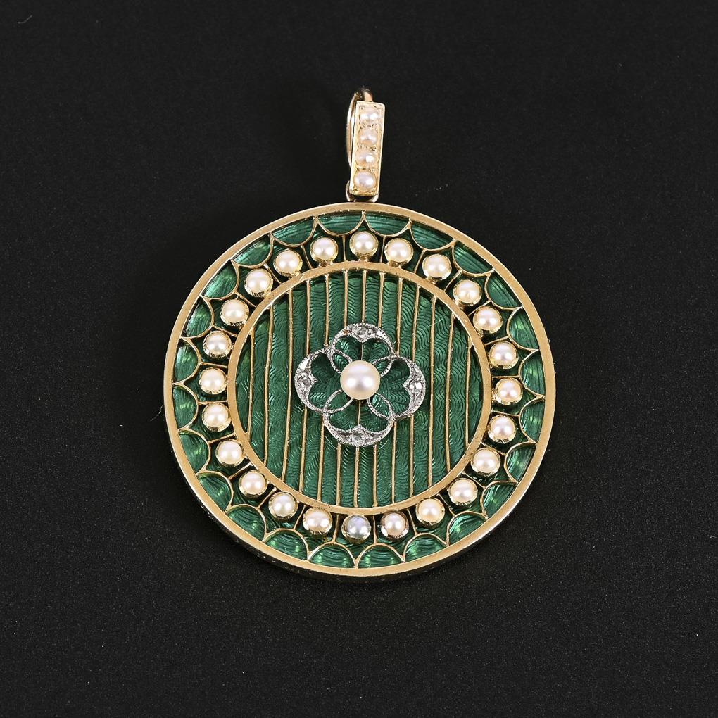 Großer, durchbrochen gestalteter Anhänger mit gefassten Perlchen, 4 kleinen Diamantrosen in Millegriffes-Mitte und unterlegter, guillochierter Scheibe mit grünem Transluzidemail. Rückseitig mit Patentverschluss zu befestigen. Dazu 3 auswechselbare Scheiben in blau, violett und rosafarben sowie kleiner Verschluss-Dreher. In weinrotem Originaletui.