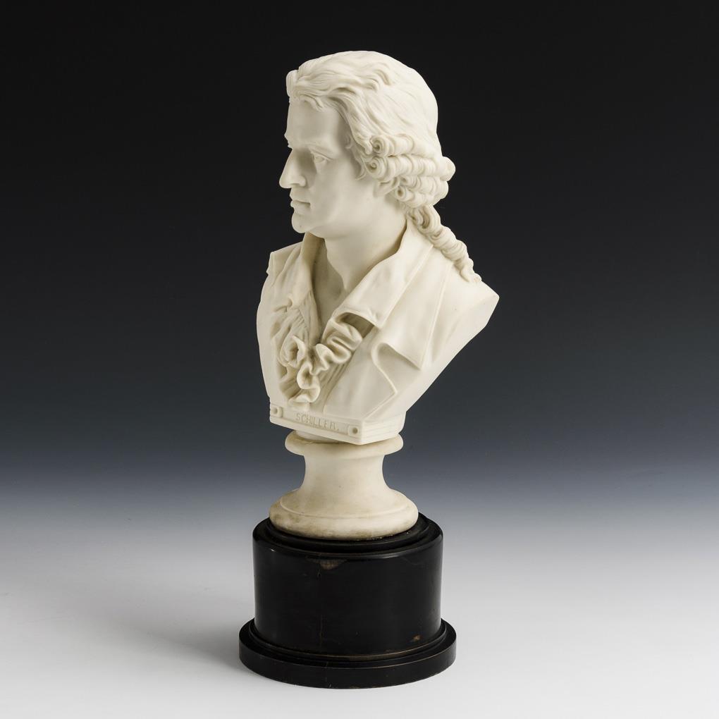 Biskuitbüste des Dichter mit nach rechts gewendetem Kopf. Am Biskuitsockel geklebt, Riss im Holzsockel.