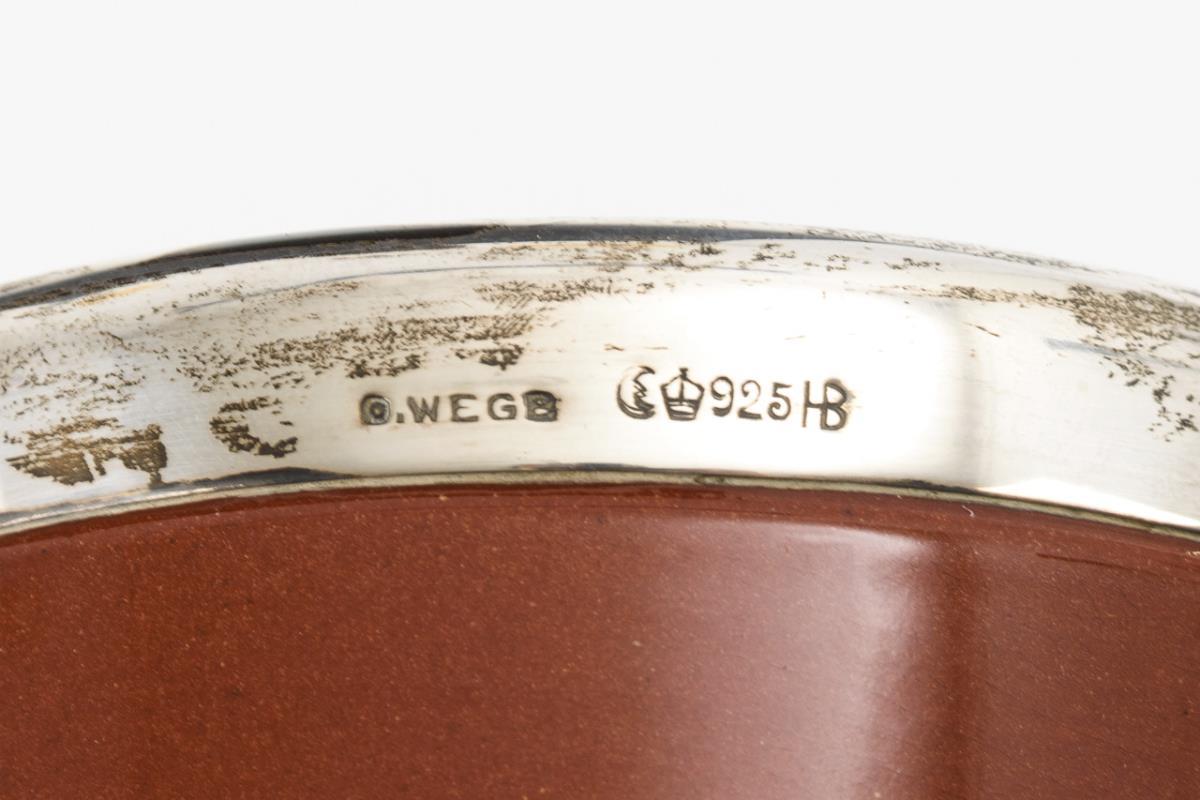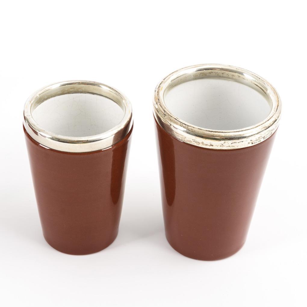 Rotbrauner, glasierter Scherben. Silbermontierung Halbmond/Krone/925/Firmenmarke Hermann Behrnd (Silberwarenfabrik Dresden 1881-1967) gepunzt. H 11 und 12,3 cm.