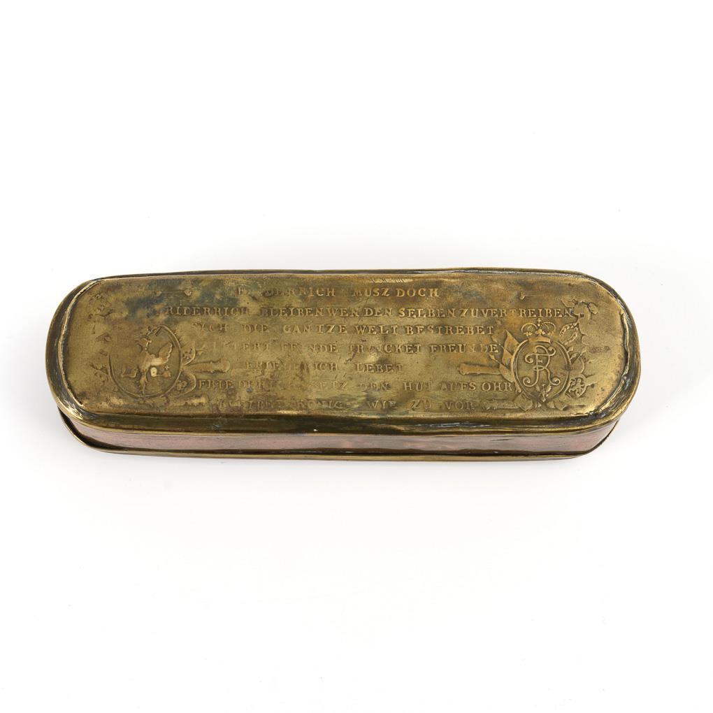 Auf dem Scharnierdeckel die Herrscher von Preußen, Österreich und Sachsen, flankiert von Borussia und dem Siegesgenius sowie Bezeichnung. Auf dem Boden Spruch "Friedrich muss doch Friedrich bleiben ..." zwischen preußischem Adler und Monogramm FR (Friedrich der Große). Starke Alters-/Gebrauchsspuren.