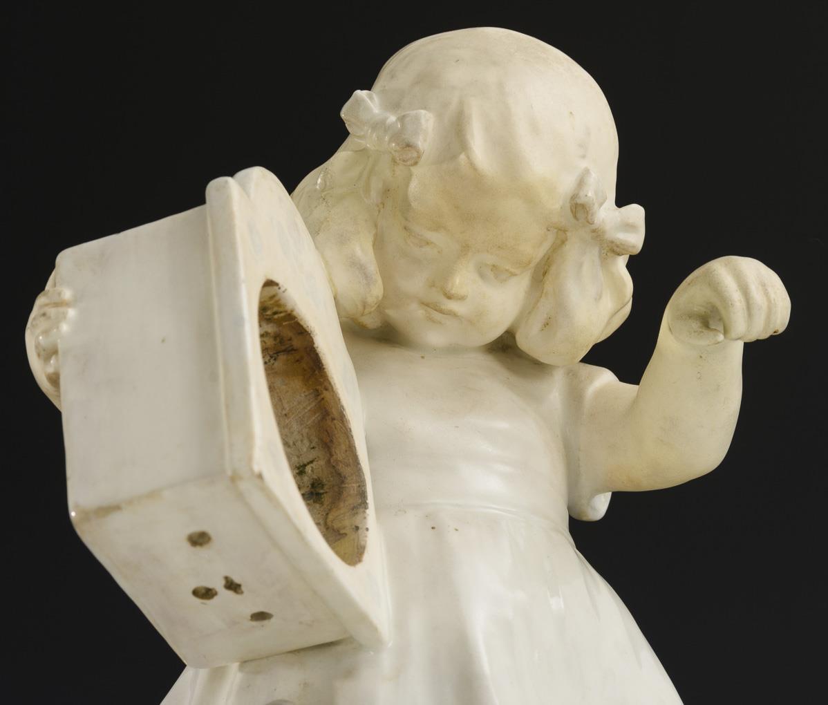 Eine Schilduhr haltendes Mädchen mit spielender Katze, auf Rundsockel. Ohne Uhr. Am Kleidersaum, Katzenschwanz und Sockel restauriert.