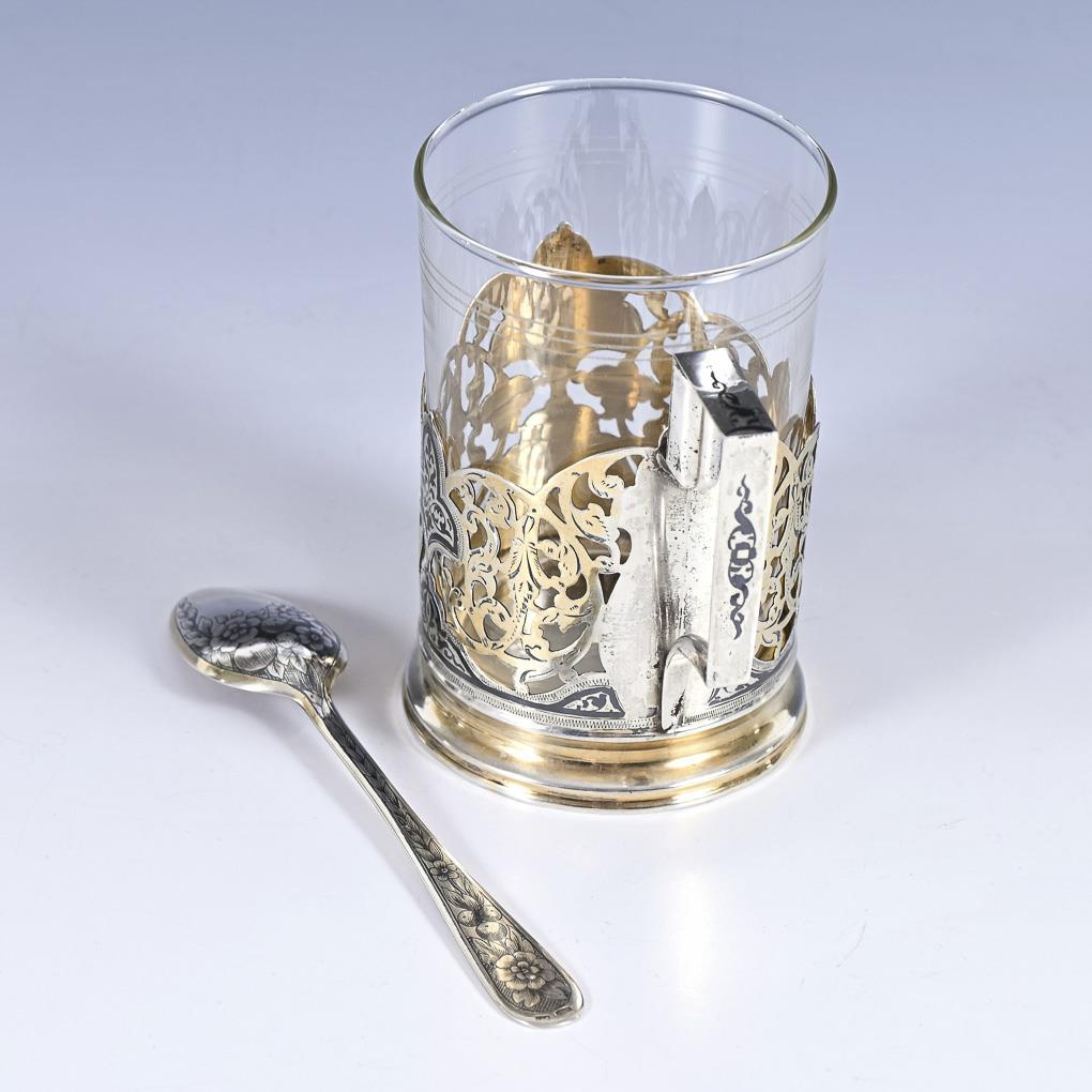 Teeglas, 2 Wodkabecher, Fingerhut und Löffel. In Niello-Technik verziert. Kaum Gebrauchsspuren.