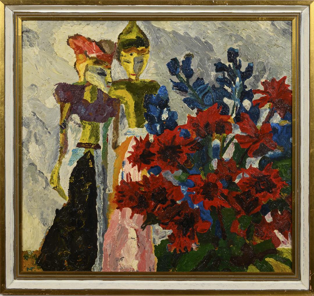 Monogrammist: Modernes Stillleben mit Blumen und Figuren