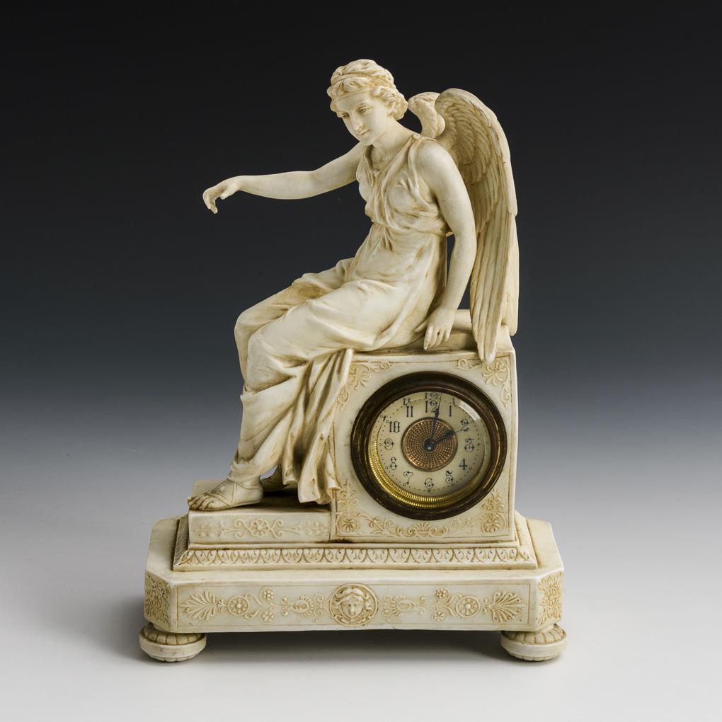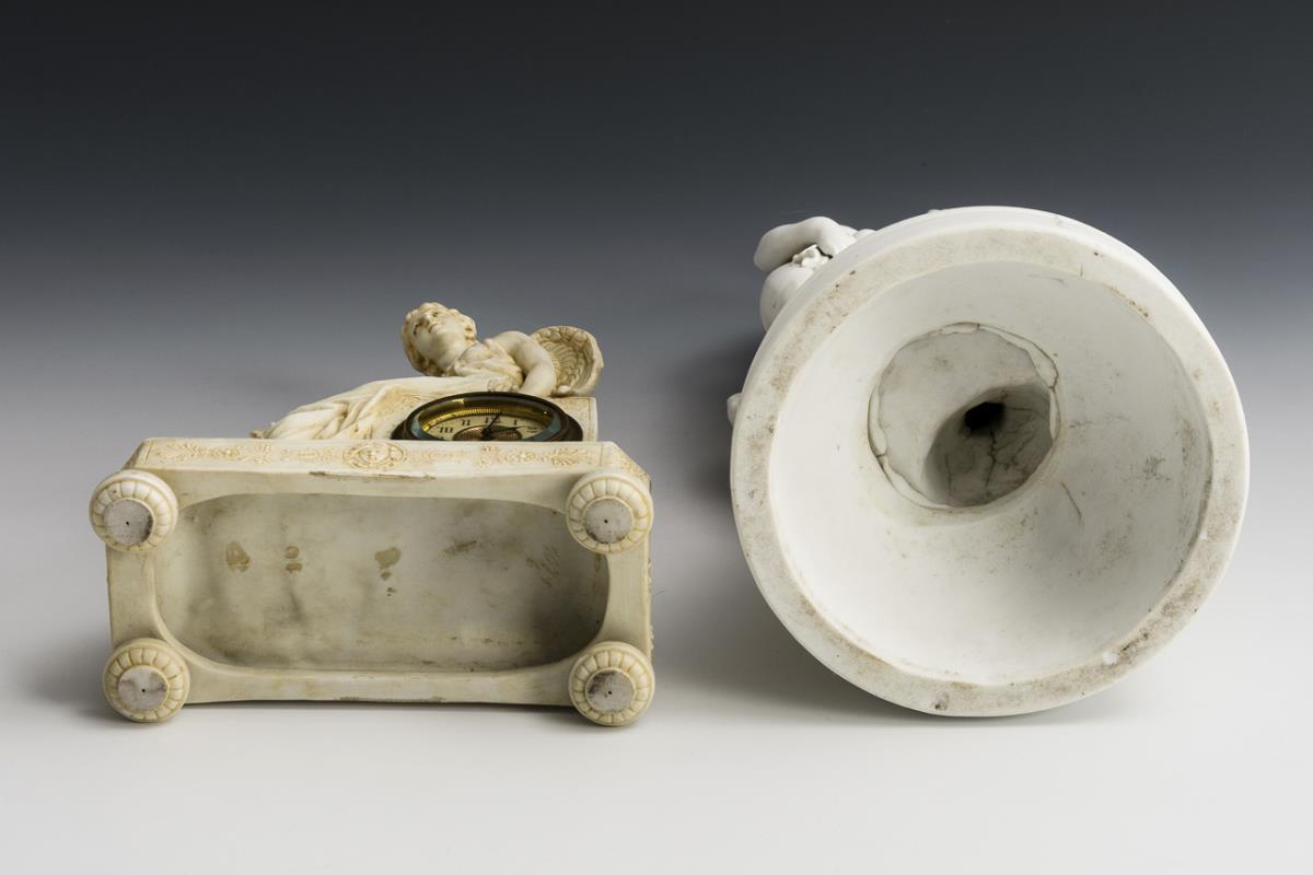 1x Uhr mit einem auf dem Gehäuse sitzendem Engel mit Stundenglas(?); Uhr läuft an. / 1x Plastik der an einem Felsen stehenden Venus, auf den Amorknaben mit Pfeilen und Köcher schauend. Uhr: Stundenglas des Engels fehlt, rechter Daumen bestoßen, Bestoßung an 1 Flügelspitze; Venus: 4 Brandrisse im Sockel, 1 Pfeilspitze bestoßen.