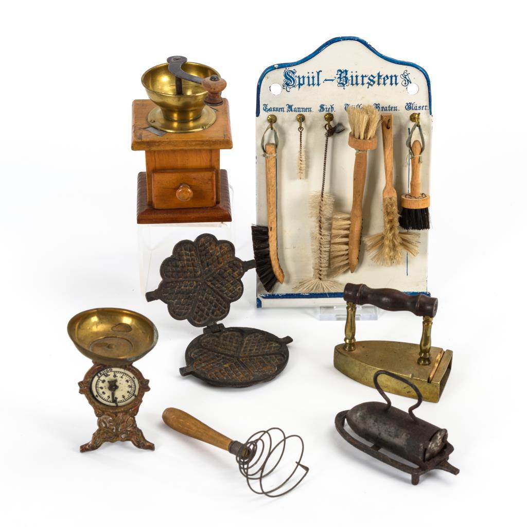 Kaffeemühle, Wandblech "Spül-Bürsten", 2 Bügeleisen, eisernes Waffeleisen, Quirl und Küchenwaage. Altersspuren, teils etwas korrodiert.